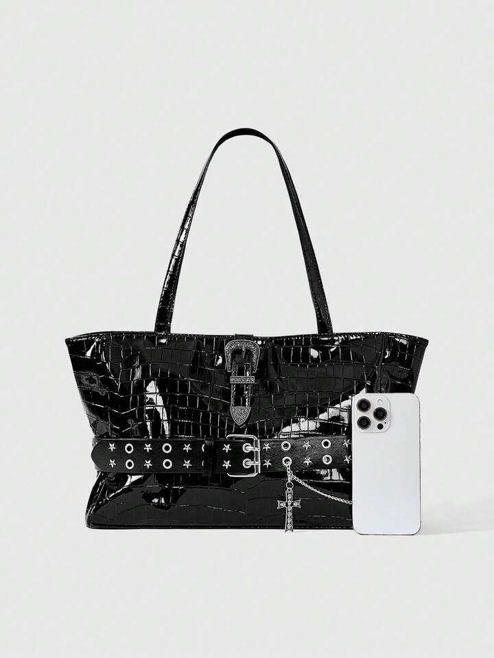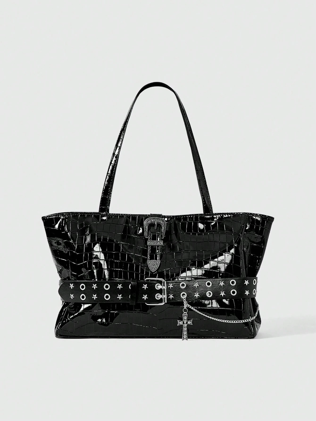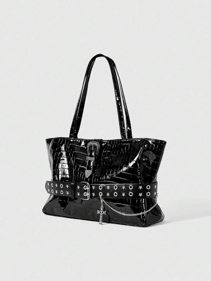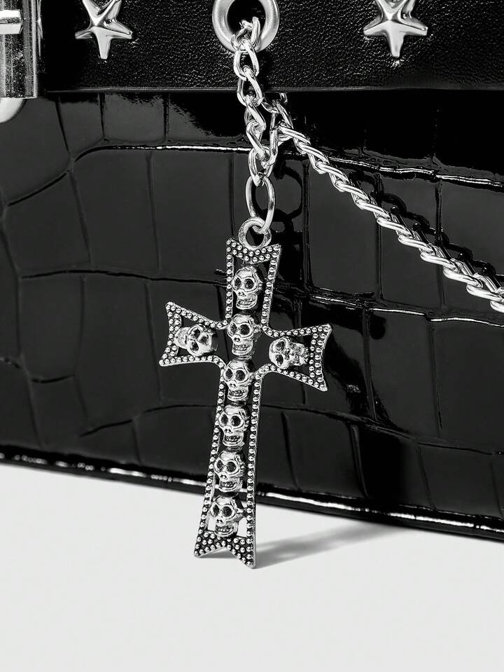 Goth Sternförmiger Ledergürtel, Kreuzkette, glänzende Leder-Umhängetasche, Cut-Out