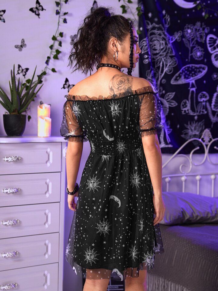 Goth Kleid mit Sonne & Mond Grafik Kontrast Netzstoff