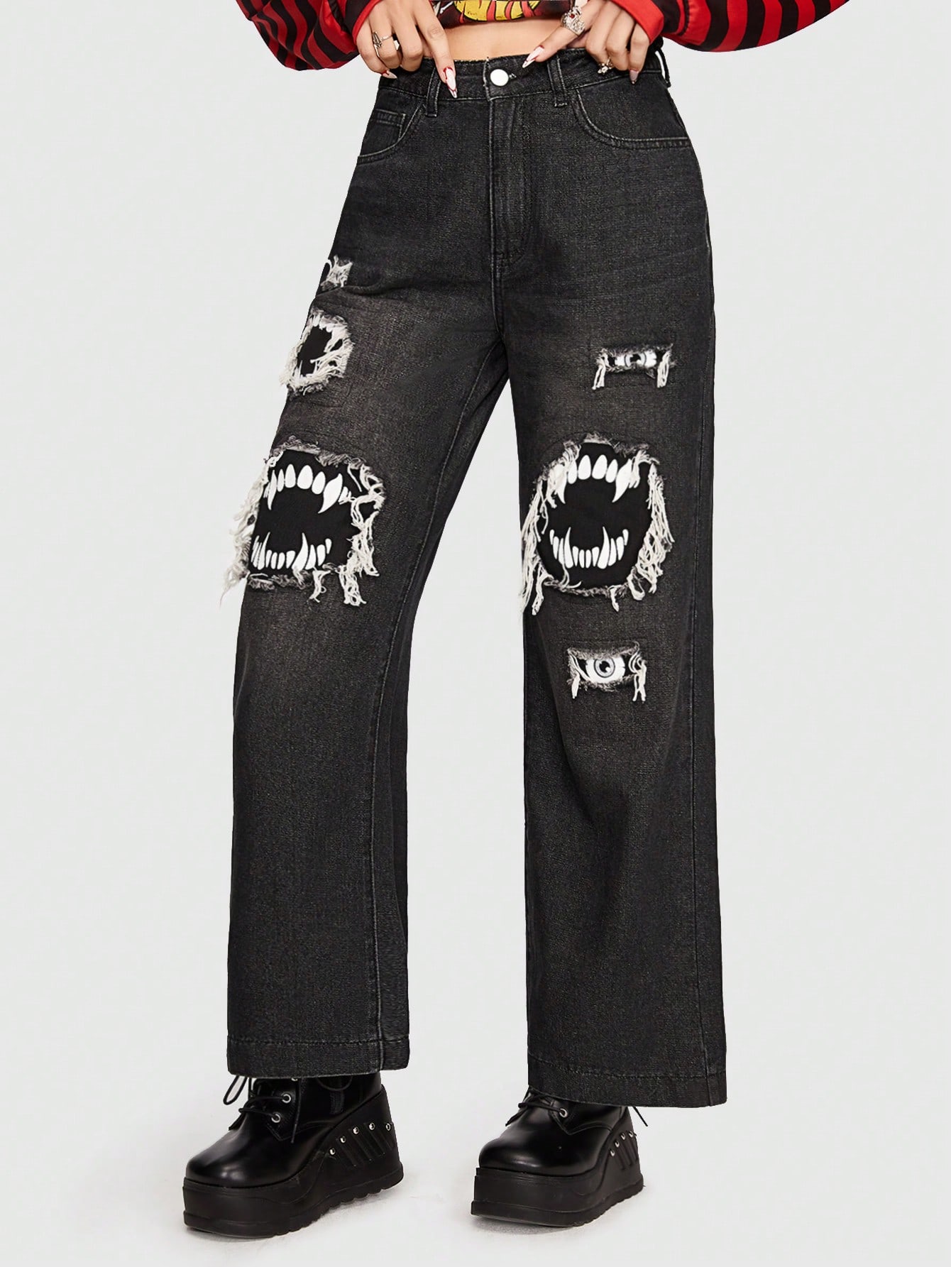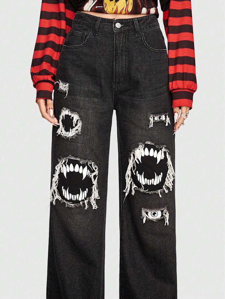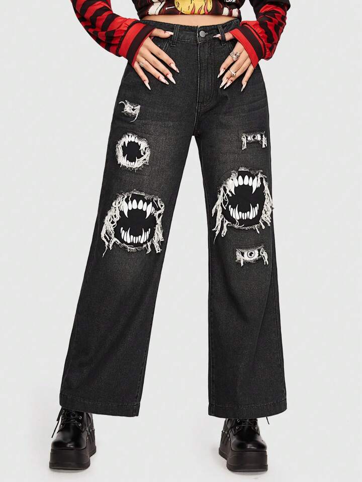 Goth Jeans mit Zähne Grafik, breitem Beinschnitt,