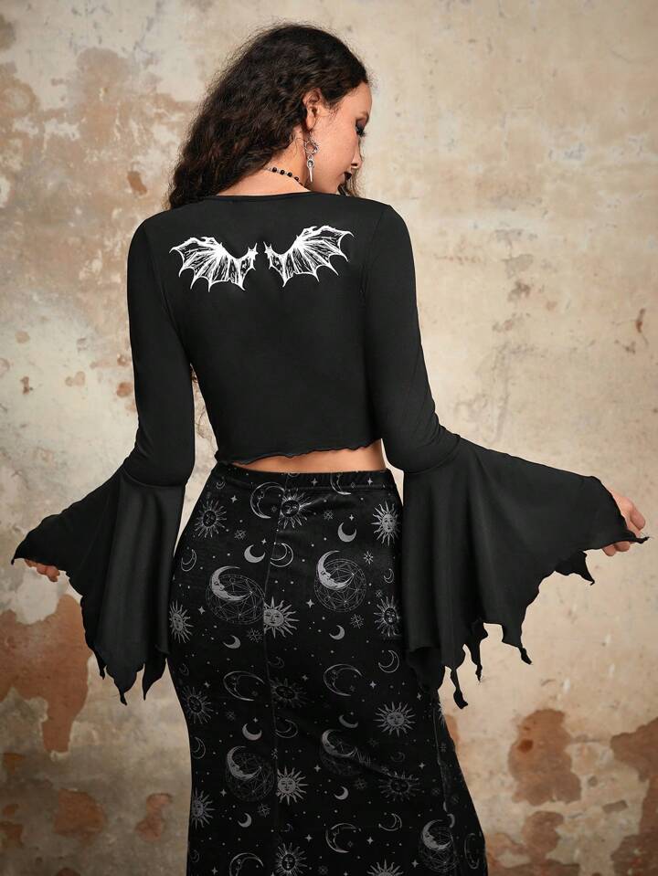 Goth T-Shirt mit Flügel Muster, Glockärmeln,
