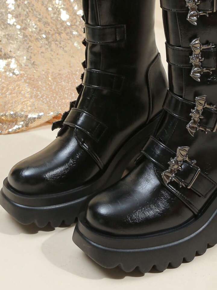 Goth Frauen Fledermaus Schnalle Dekor, Reißverschluss hinten, Plateau, klobigem Absatz, Kampfstiefel , Punk Outdoor Stiefel