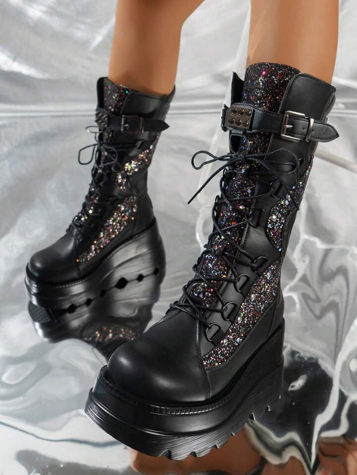 Goth Frauen Schnalle Dekor, Kontrast Pailletten, Mittelkalb Stiefel, Funky Outdoor Stiefel