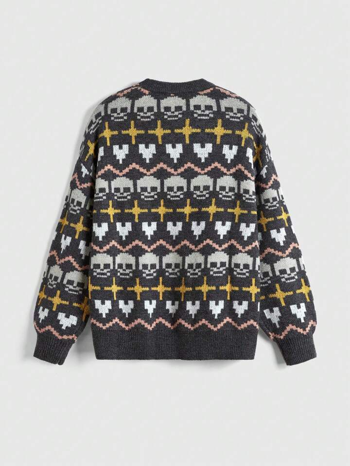 Goth Damen Rundhals Langarm Pullover mit Totenkopf- und Herz Muster, einfacher Lässig Kontrast-Strick-Pullover
