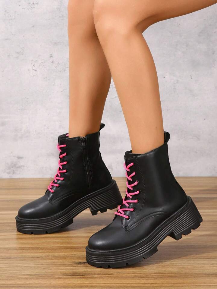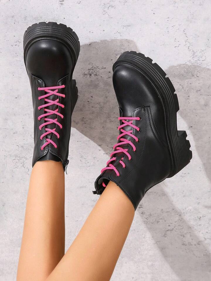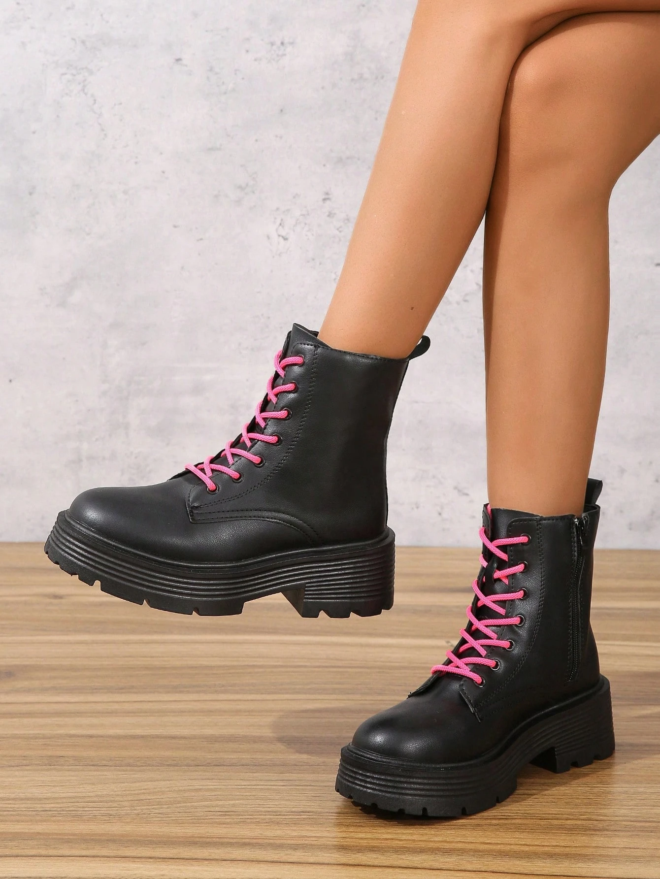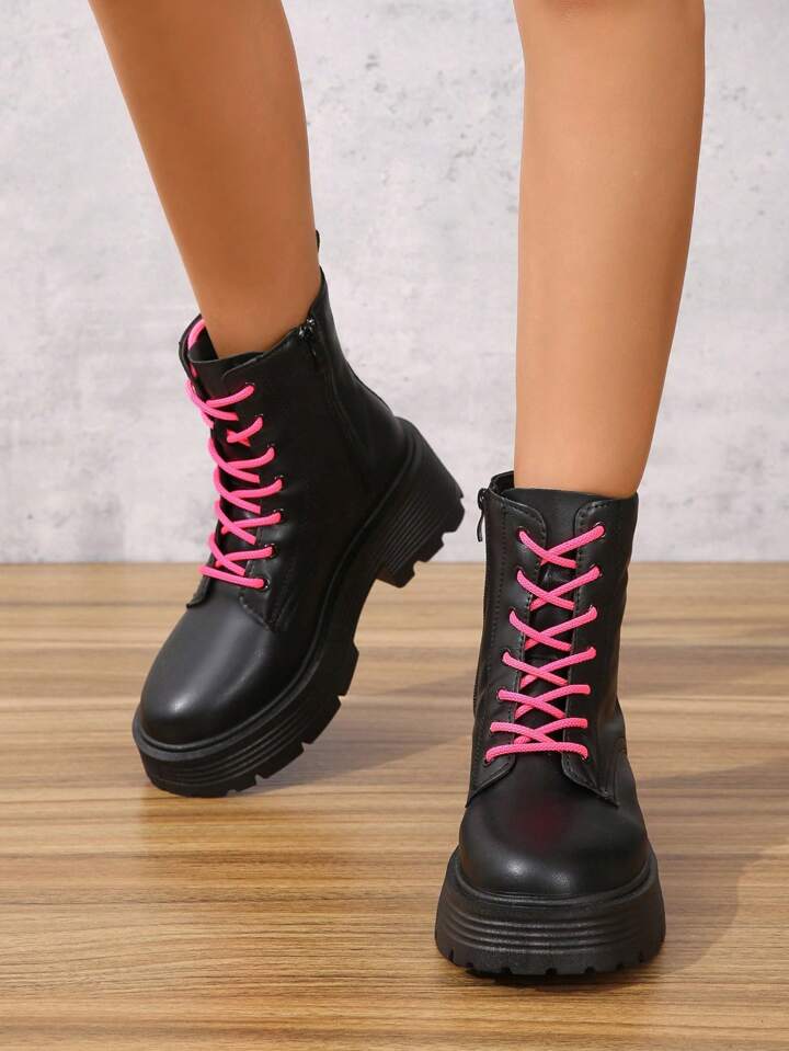 Goth Damen Stiefeletten mit Rosa Schnürsenkel und Dick Schwarz