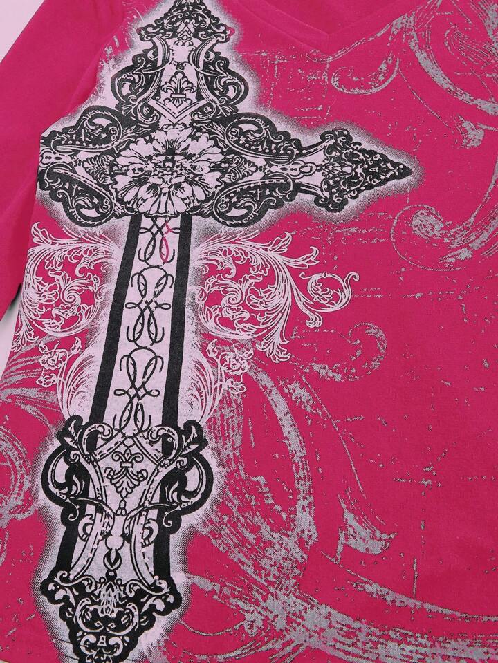Goth Damen Lässig V-Ausschnitt rosa Langarm T-Shirt mit Kreuz Muster, Herbst