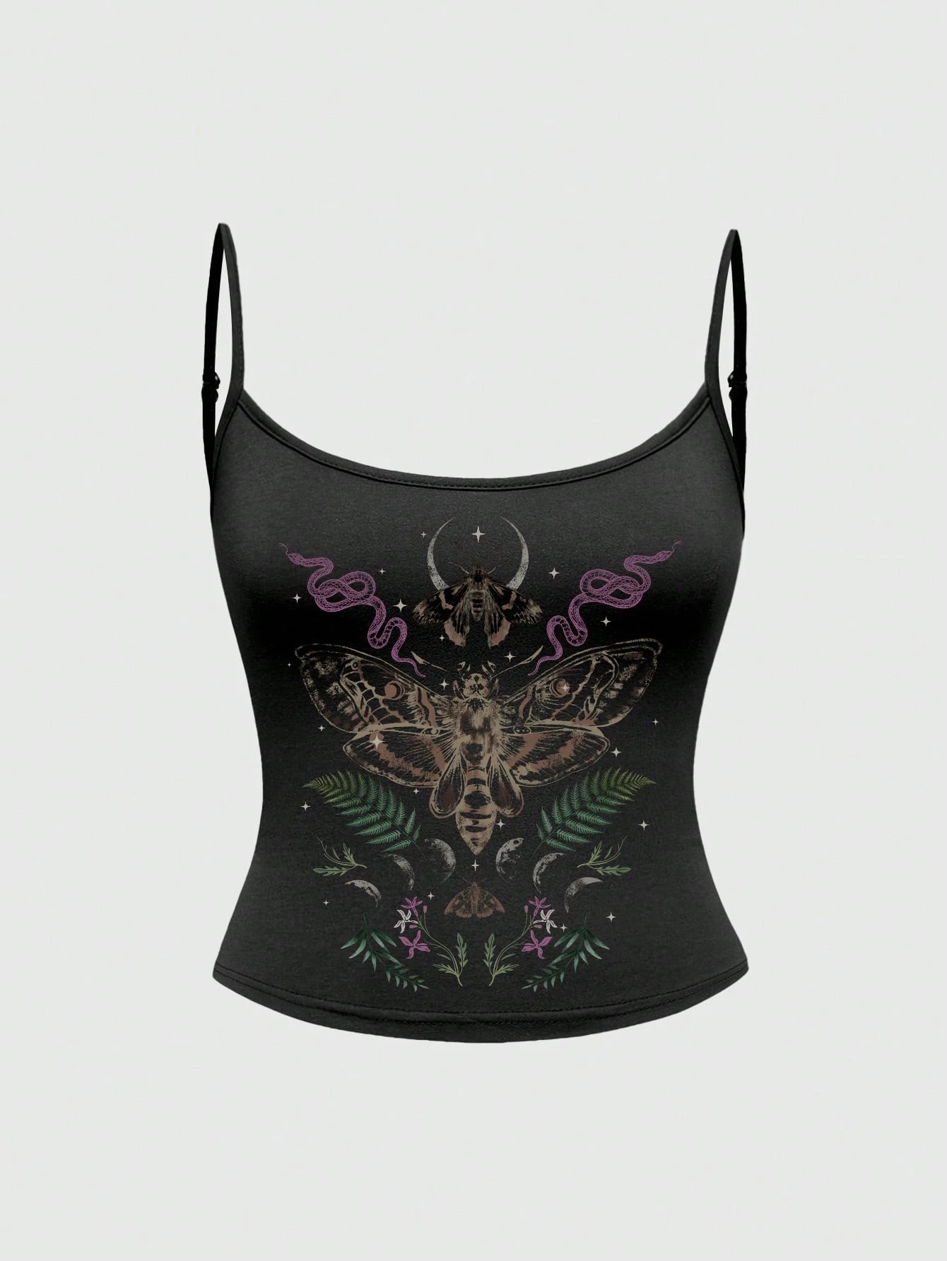 Goth Damen Lässiges, vielseitiges Alltagskleidung Top mit Mottenpflanzendruck