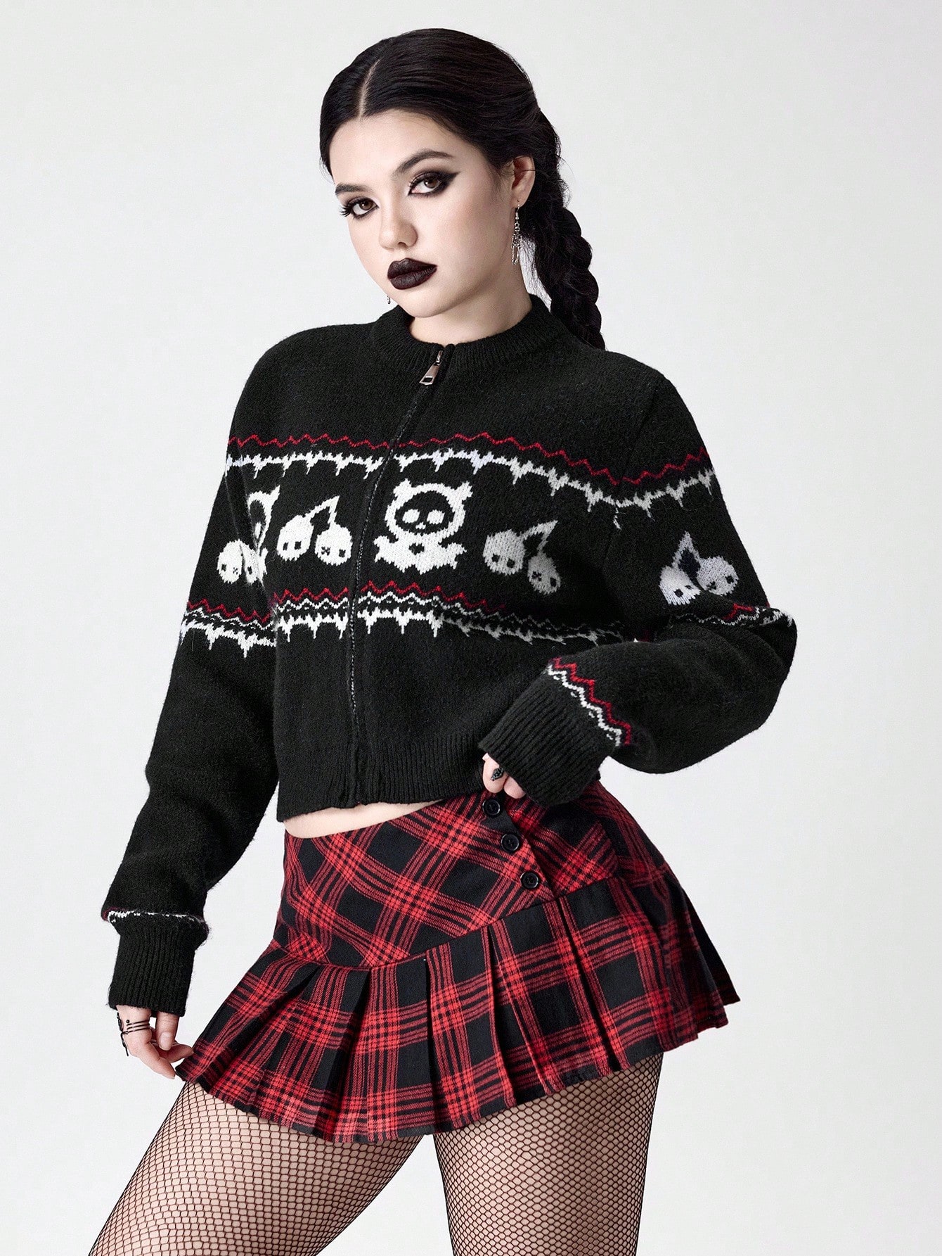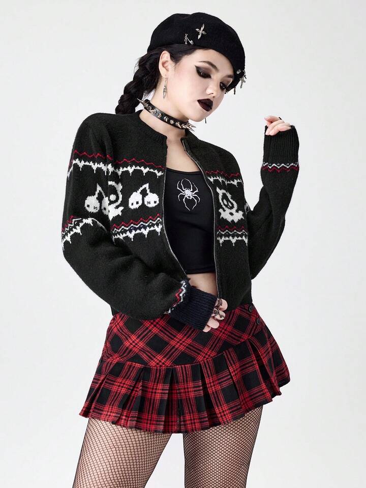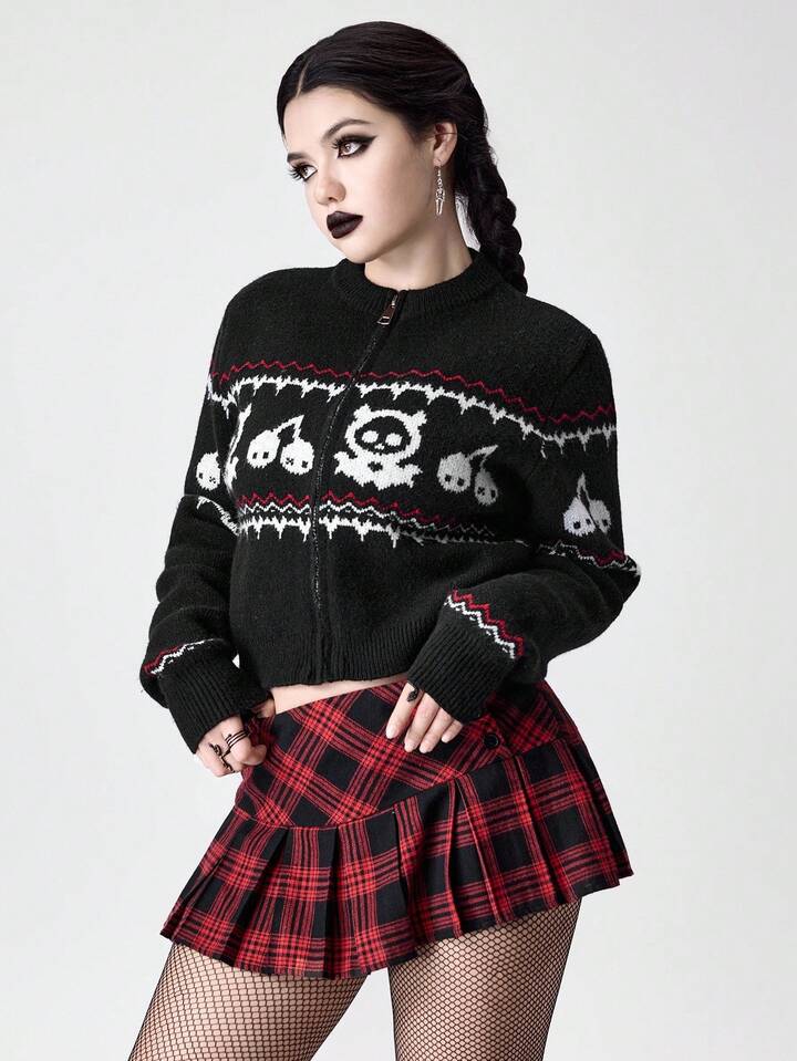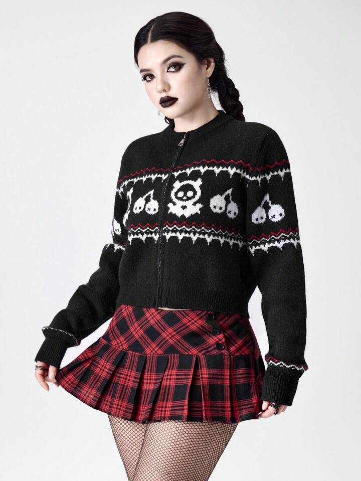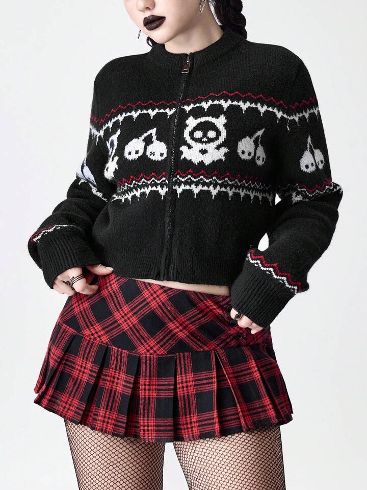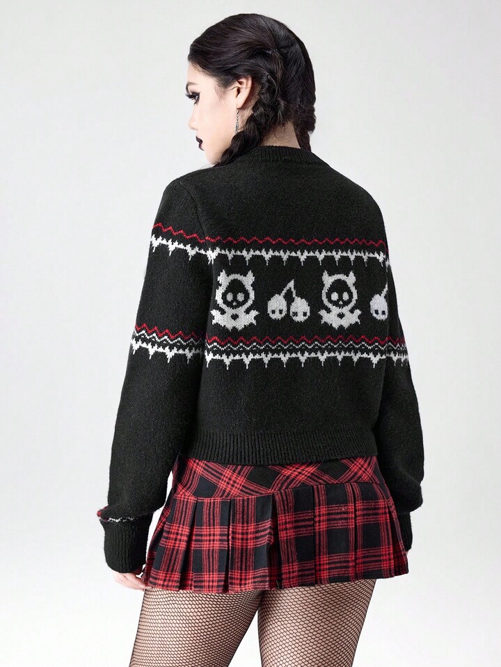 Goth Damen Dunkel Dämon Kirsche Muster Jacquard Strickjacke