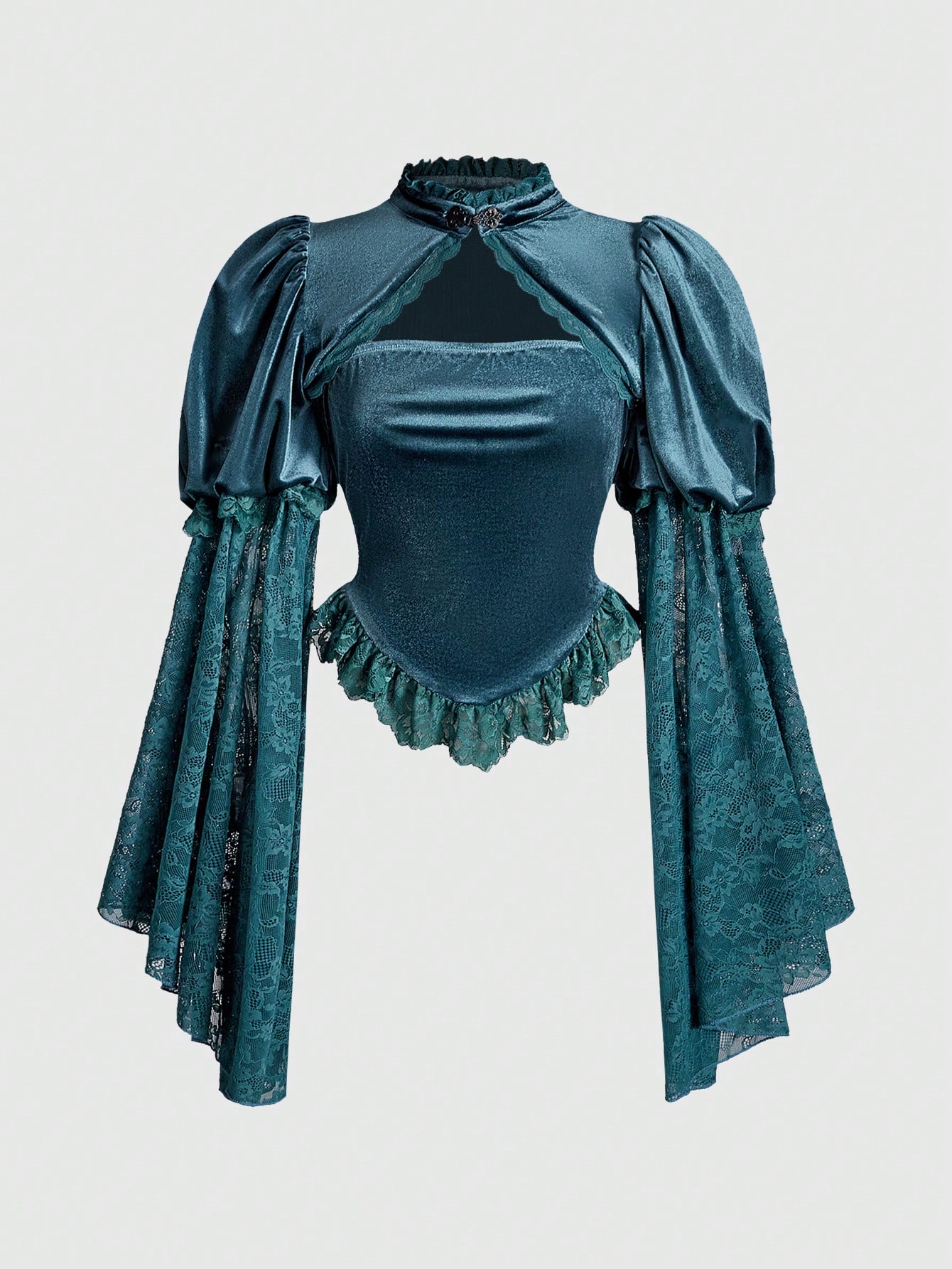 Goth Damen elegante Bluse mit Stehkragen, Glockenärmeln, Samt- und Spitzeneinsätzen