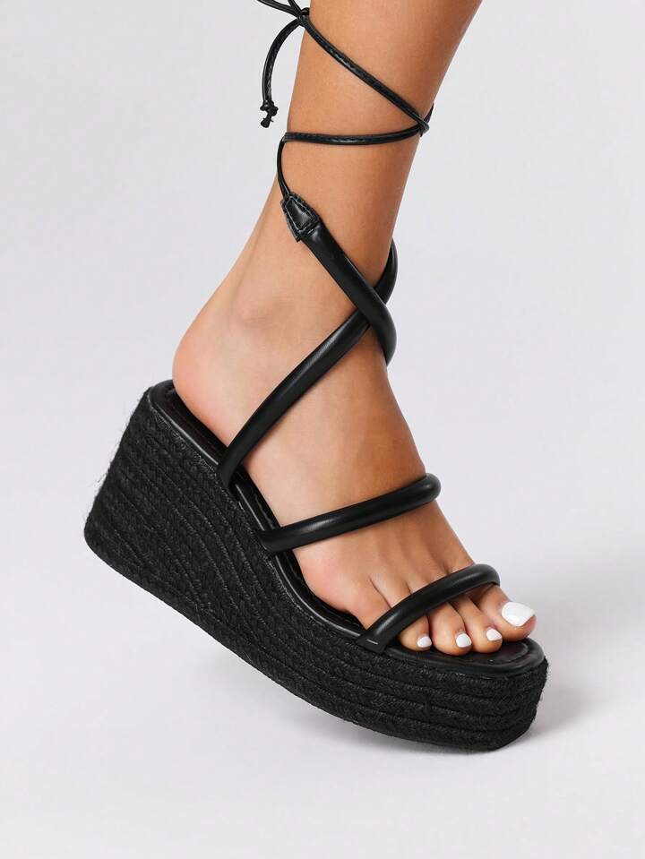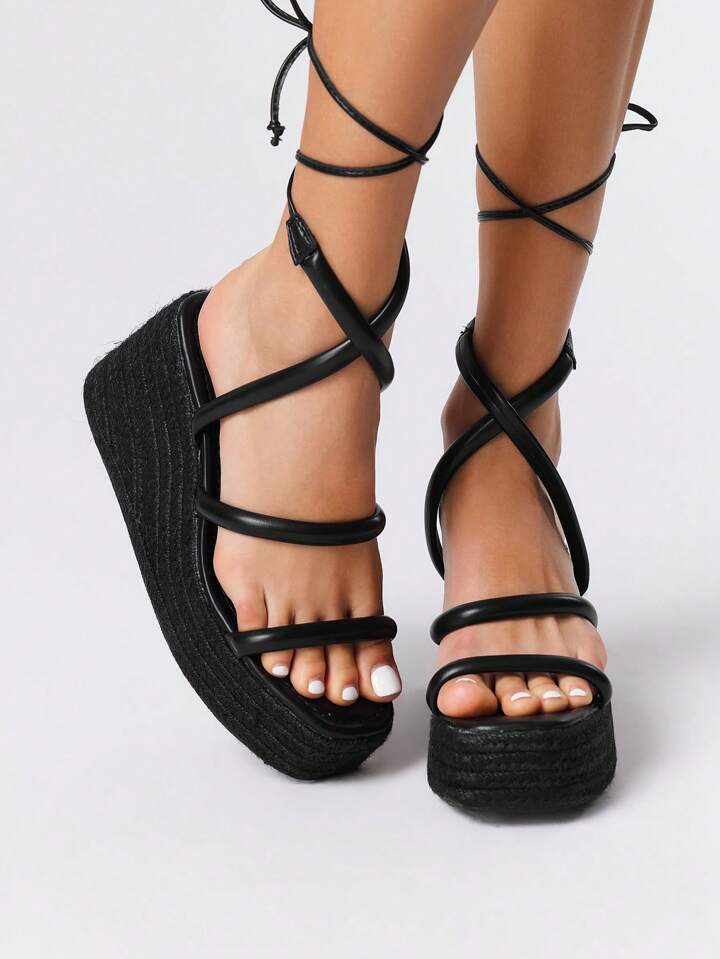 Goth Damen Mode Punk Plateau Schwarze Sandalen, Römischer Riemen Schnürsandalen Wasserfest Keilabsatz Superdicker Sohle Ultra High Heels Offene Zehen