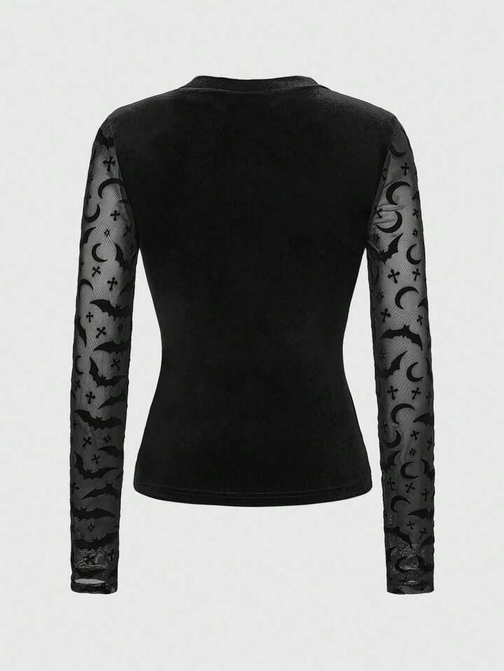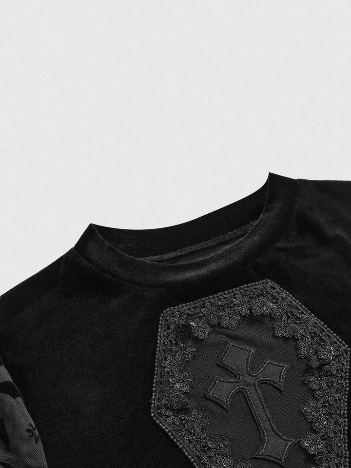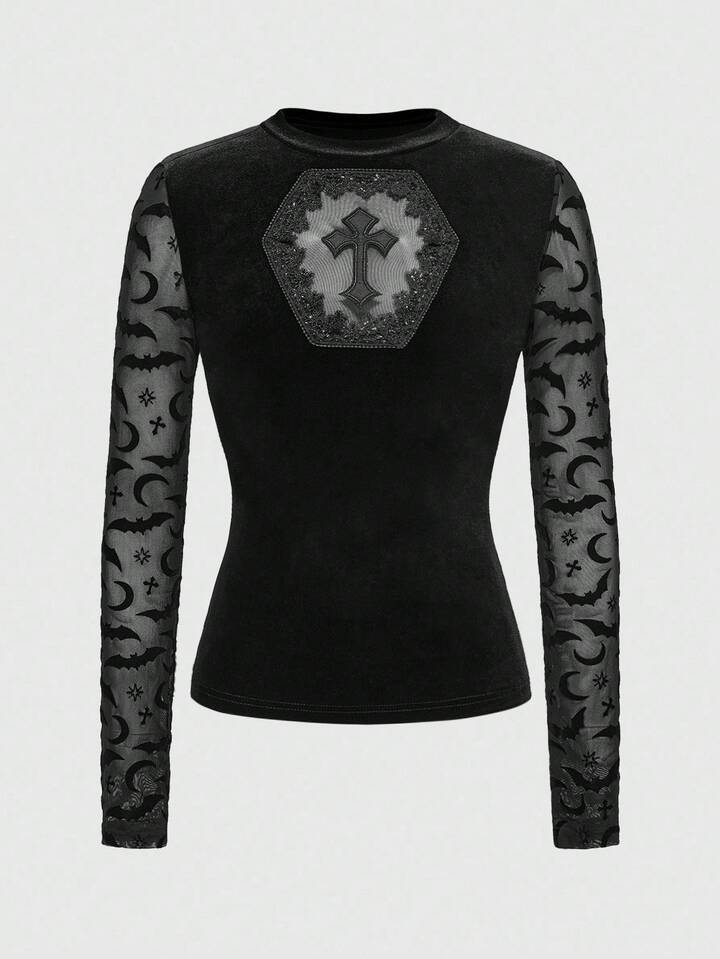 Goth Damen Cut Out Kreuz bestickte Rundhals Langarm Mode T-Shirt