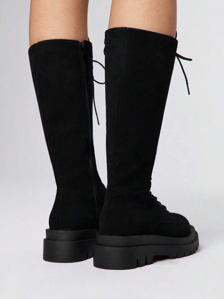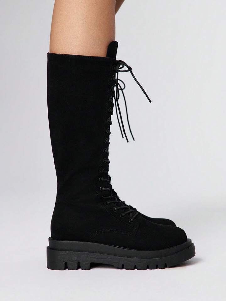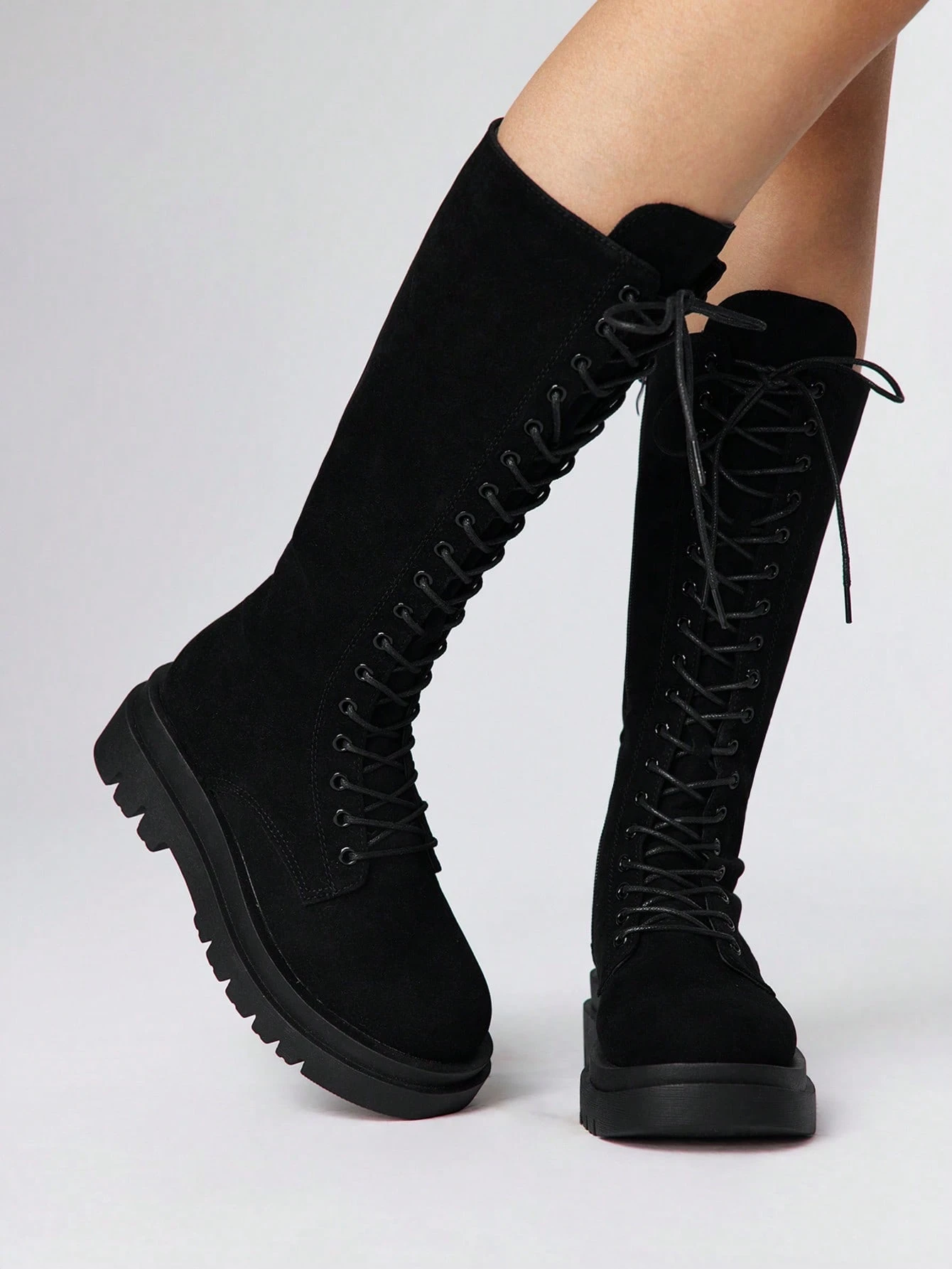 Goth Damen Kniehohe Stiefel mit modischem Schnürung, dicker Sohle und Plateauabsatz