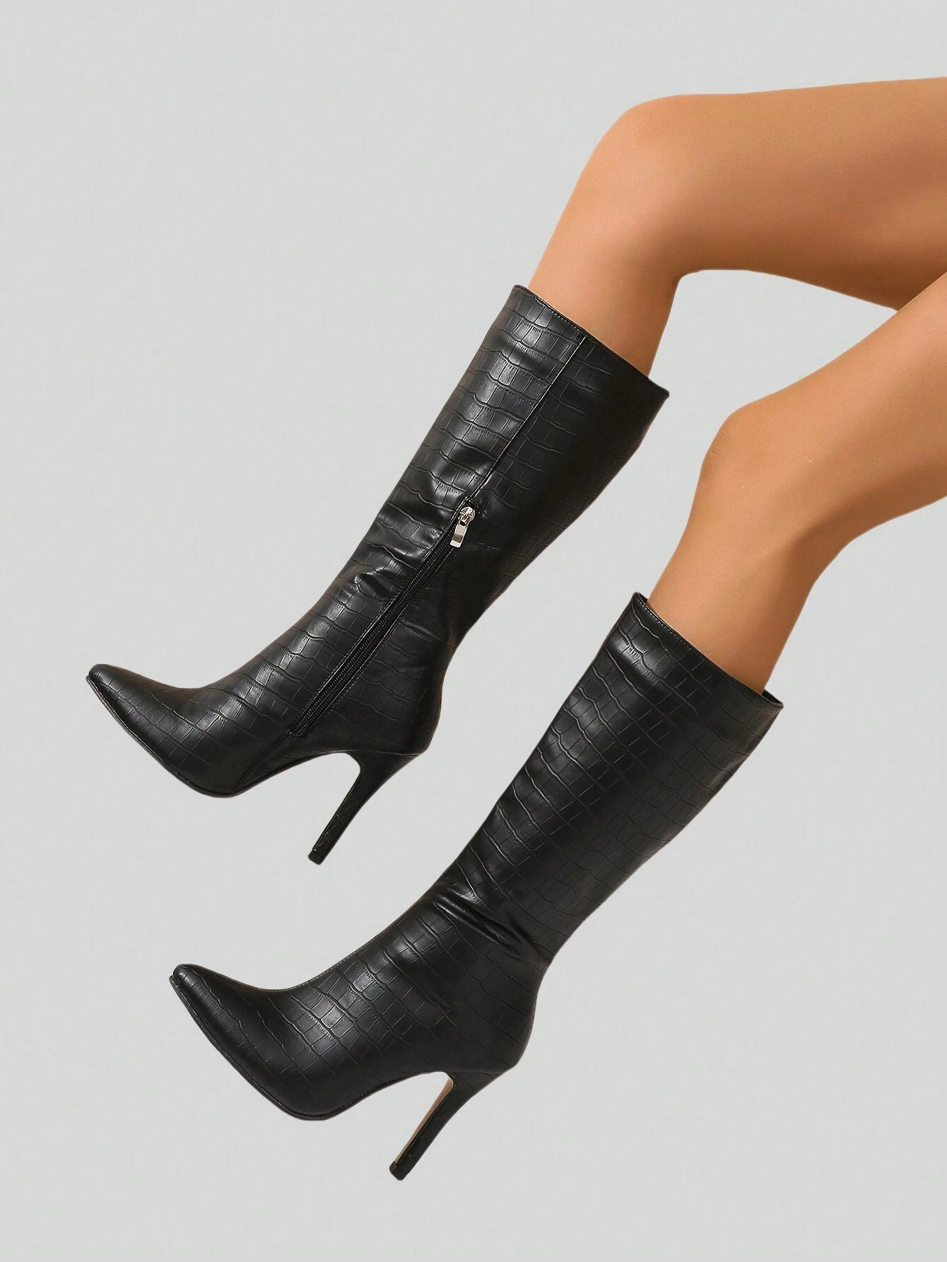 Goth Kniehohe Reiterstiefel für Damen, Neuankömmling für Herbst/Winter, schwarze spitz zulaufende Stiefel mit hohem Absatz und Western Stil, Große Größen