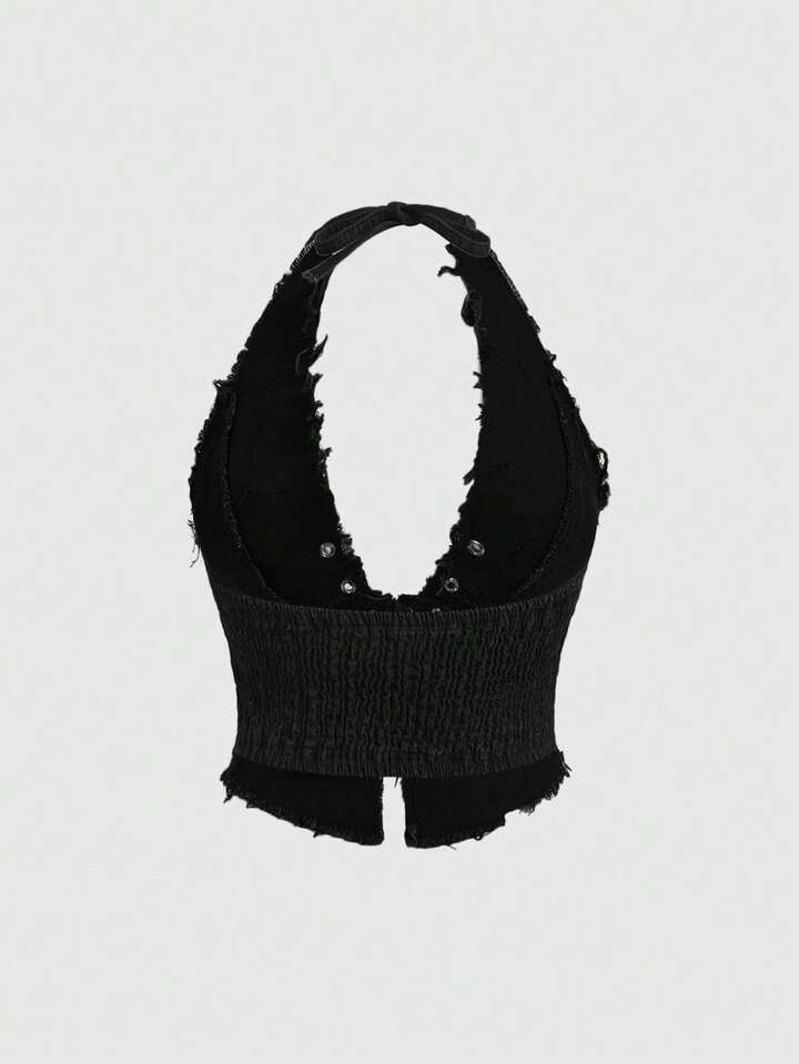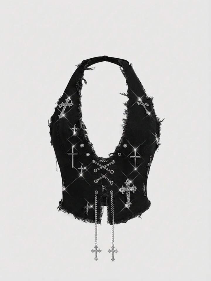 Goth Damen Retro Dunkel Kreuz Neckholder Sexy Jeans Top