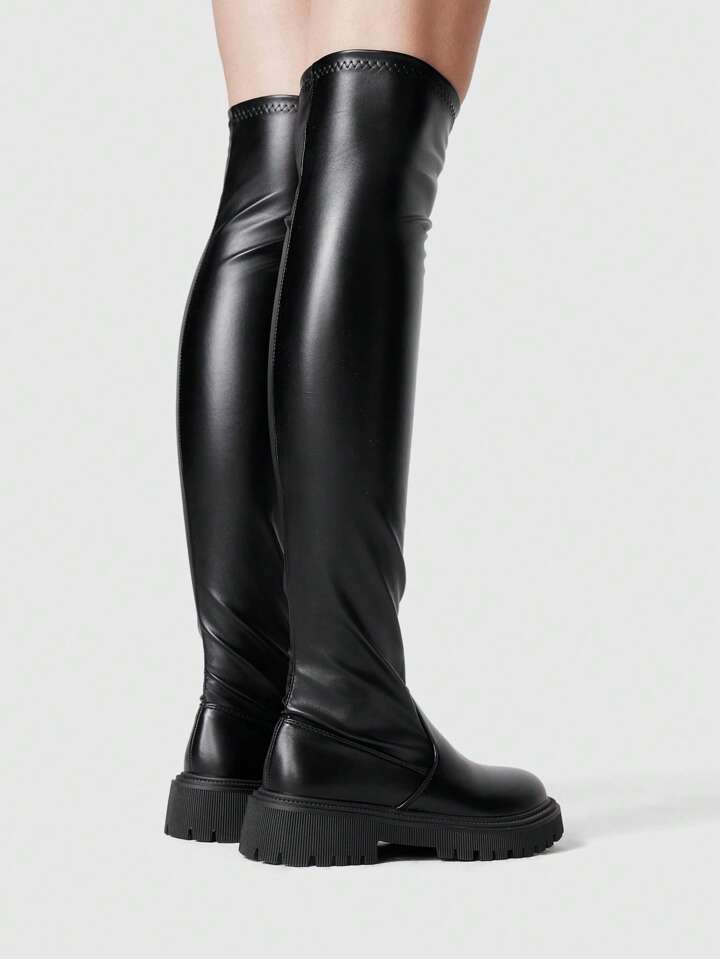 Goth Damen Stiefel mit rundem Zehenbereich, dicker Sohle, Slip-On Falten und elastischem Design, Frühling/Herbst neue Mode Leder Schaft Stiefel