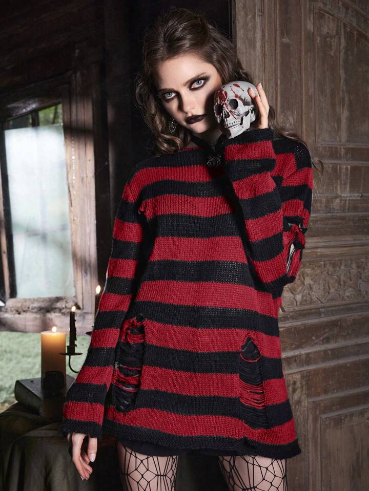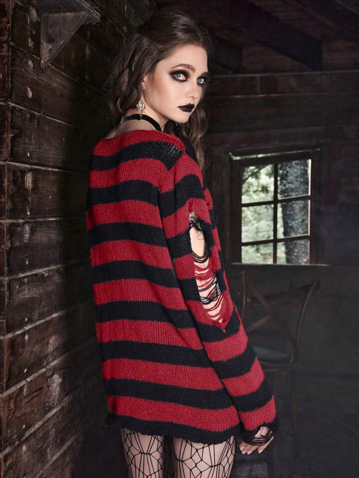 Goth Damen gestreifter zerrissener Pullover, Langarm Oberteile