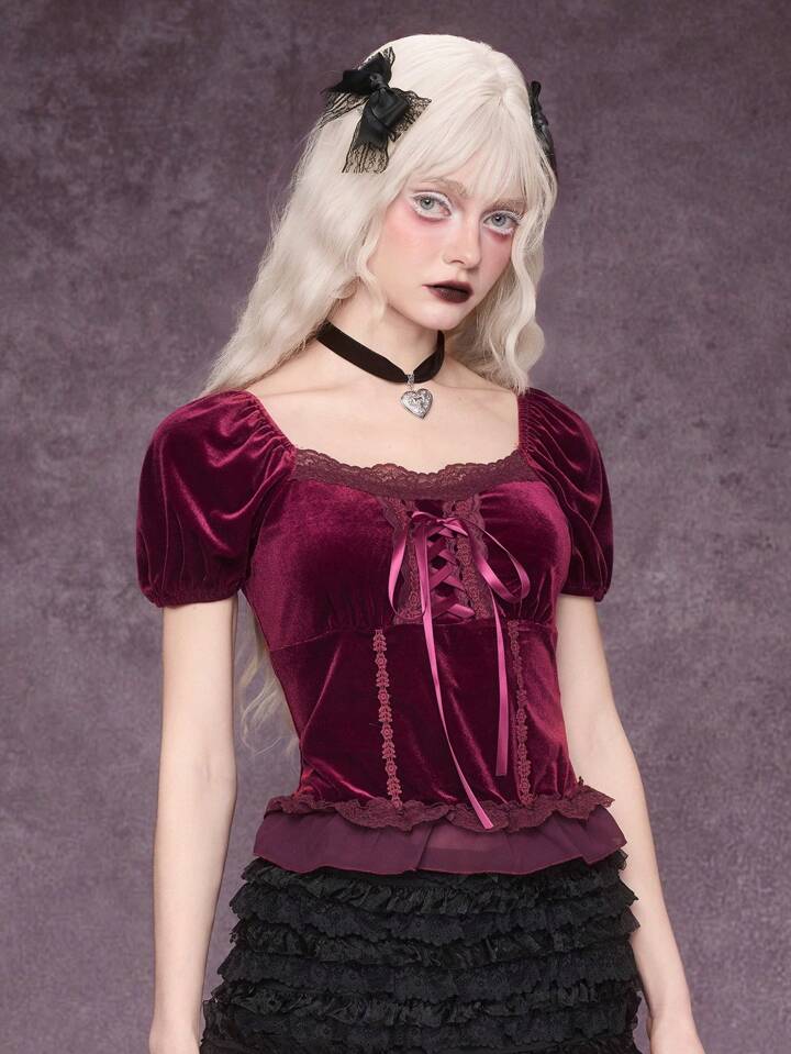 Goth Damen Samt Bluse mit Kontrast-Spitzenbesatz und Bindedesign an Puffärmeln