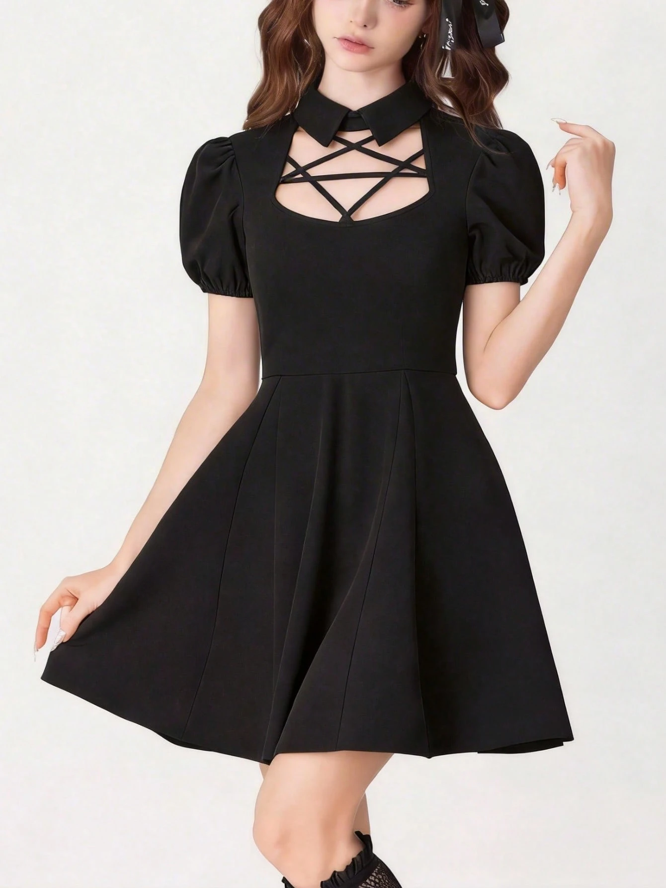 Goth Gotischer Retro Puffärmel Fünfzackiger Stern Träger Damen Kurzkleid