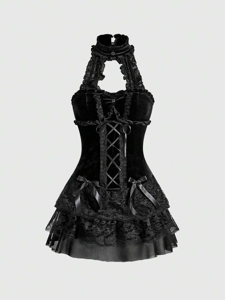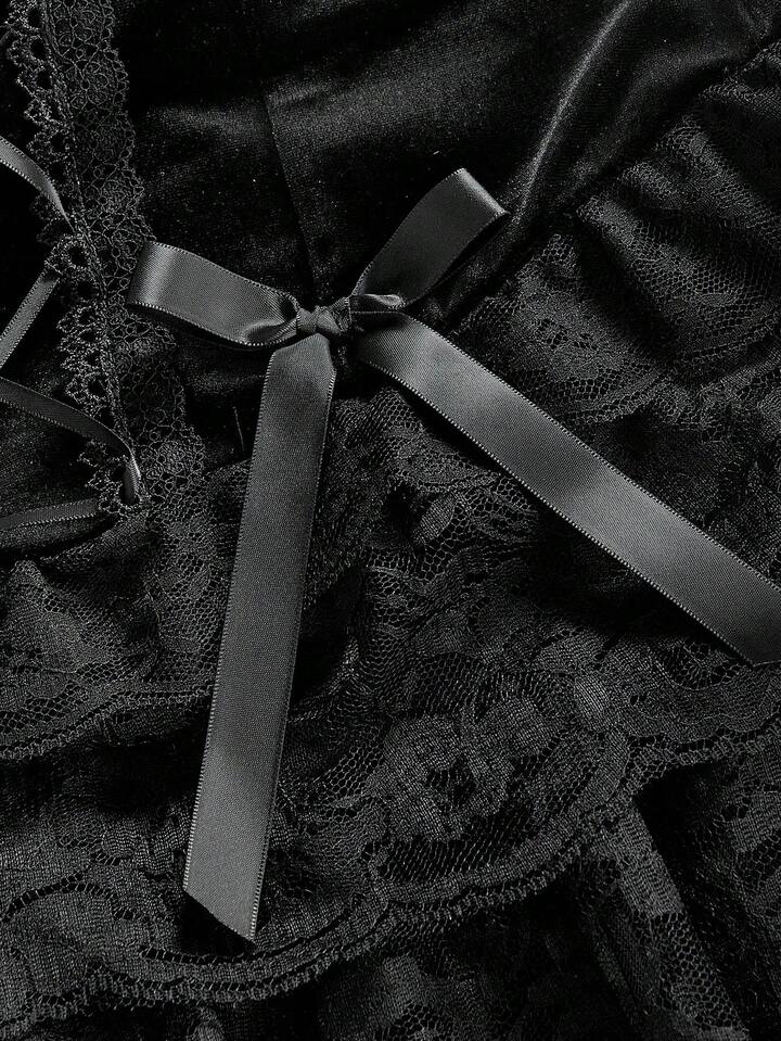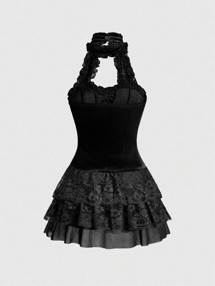 Goth Gotischer Palast romantisches luxuriöses Samt-Spitzen-Rüschen-Splice Bindegürtel Damen Kleid