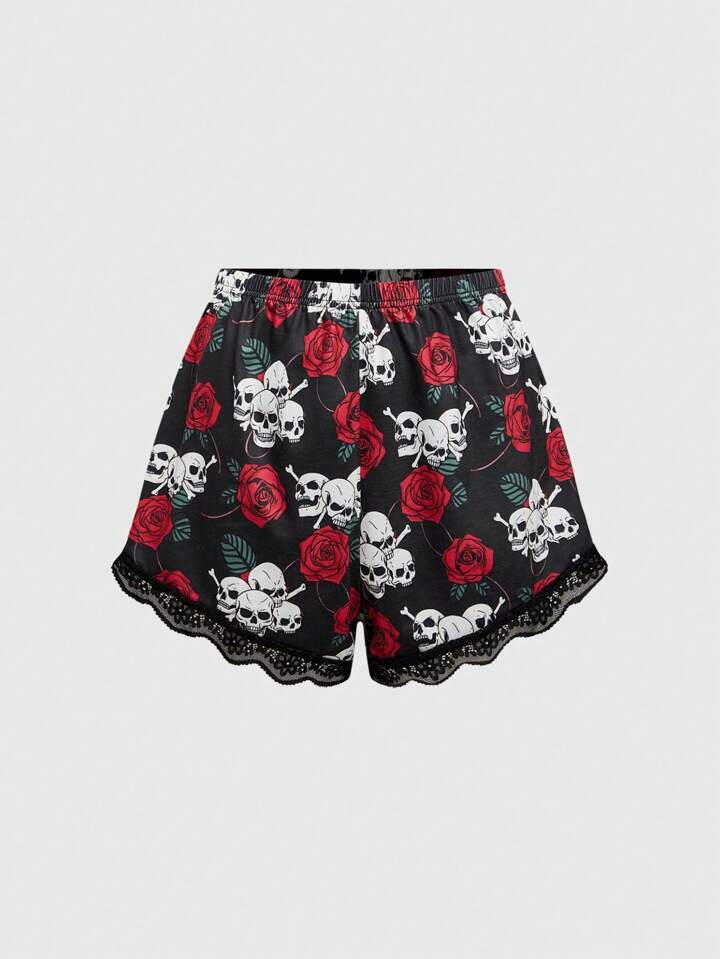 Gothic Skelett Rose Muster Kontrast Spitze Trägerhemd & Shorts Nachtwäsche Loungewear Set
