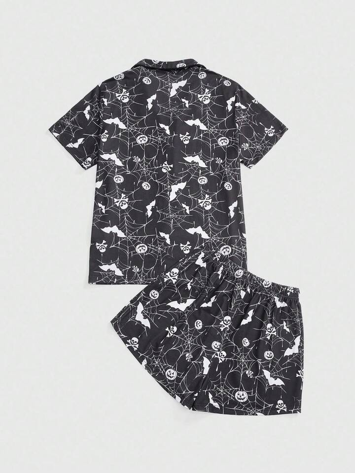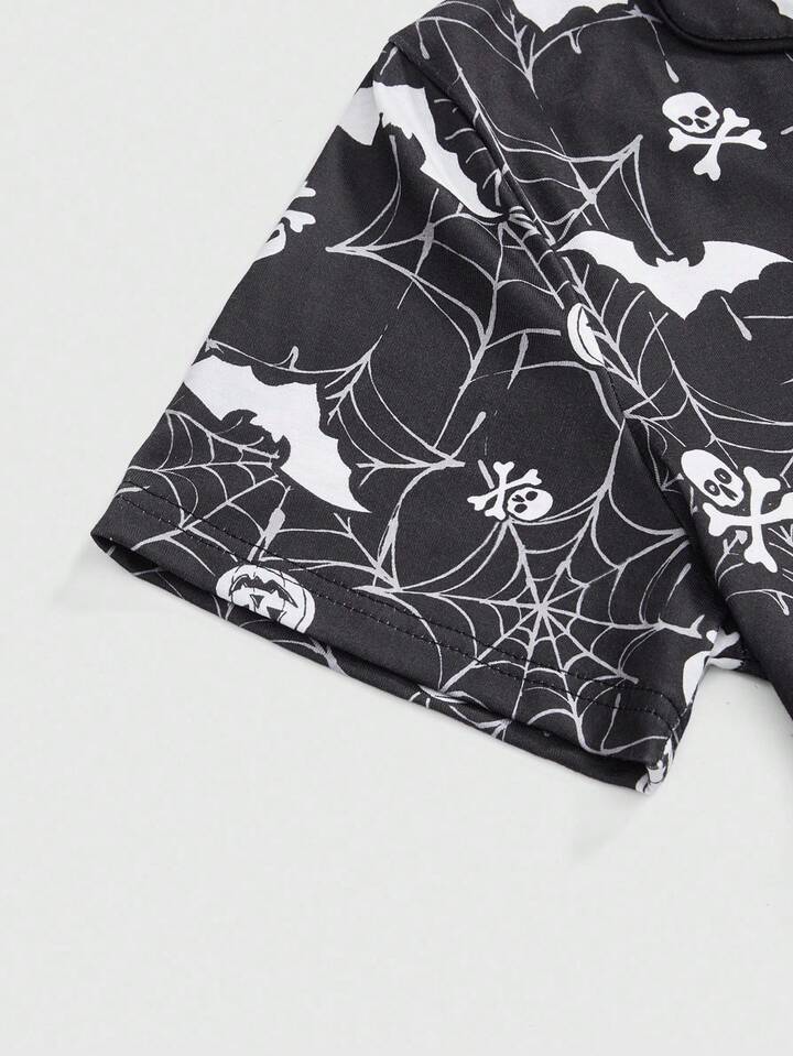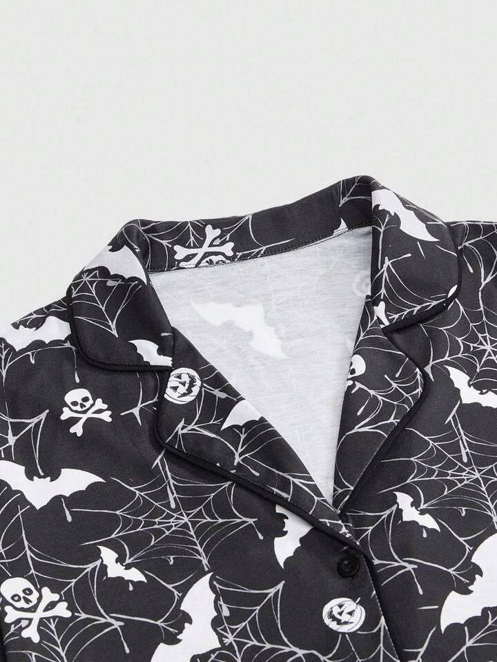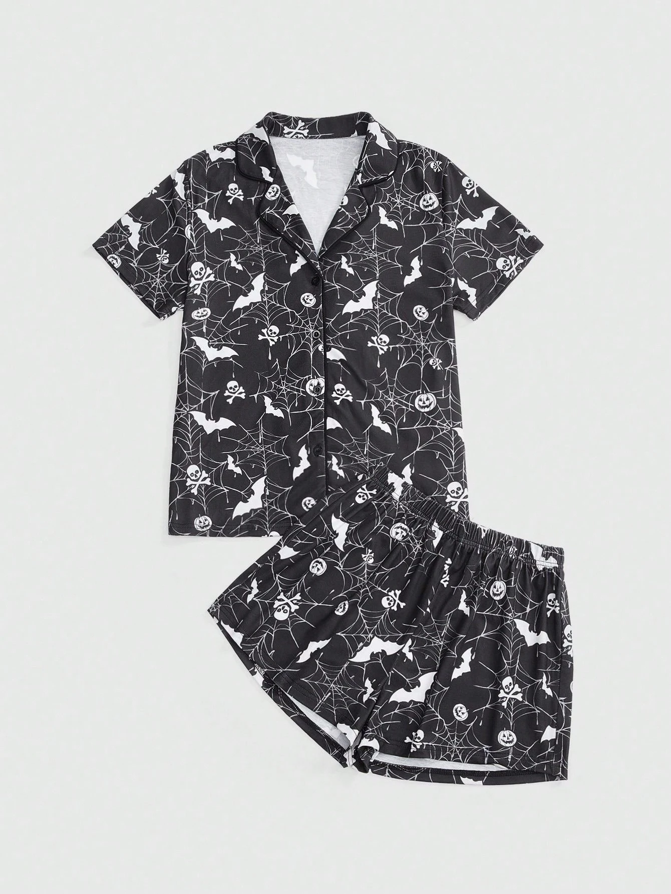 Gothic Totenkopf, Fledermaus, Spinnennetz Muster Pyjama Set aus Hemd und Shorts