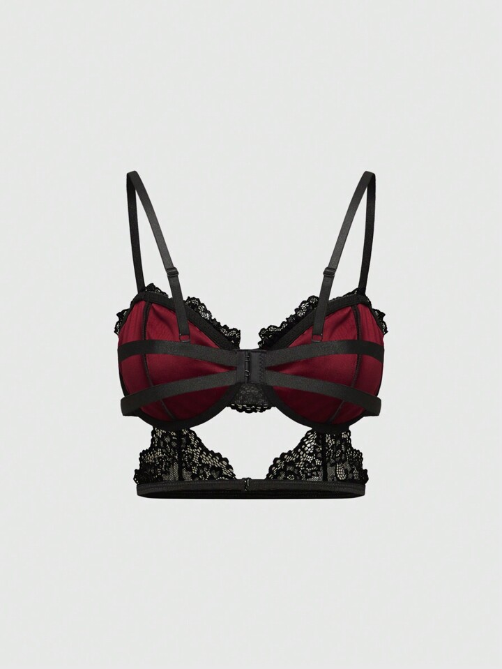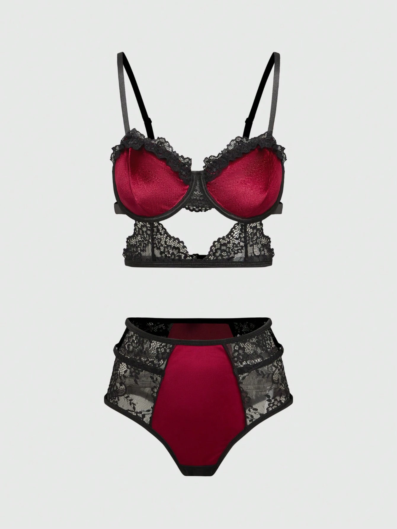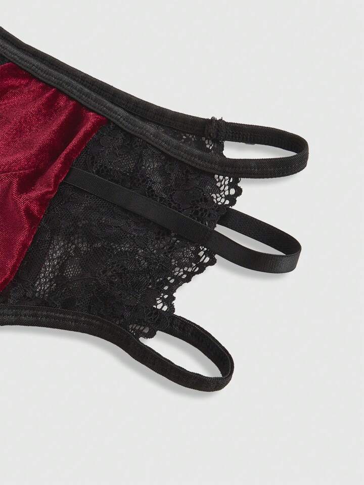 Goth Gotischer Stil Kontrast-Farbig Unterbügel-BH mit Samt und Spitze & Tanga-Slip 2-teiliges Dessous Set