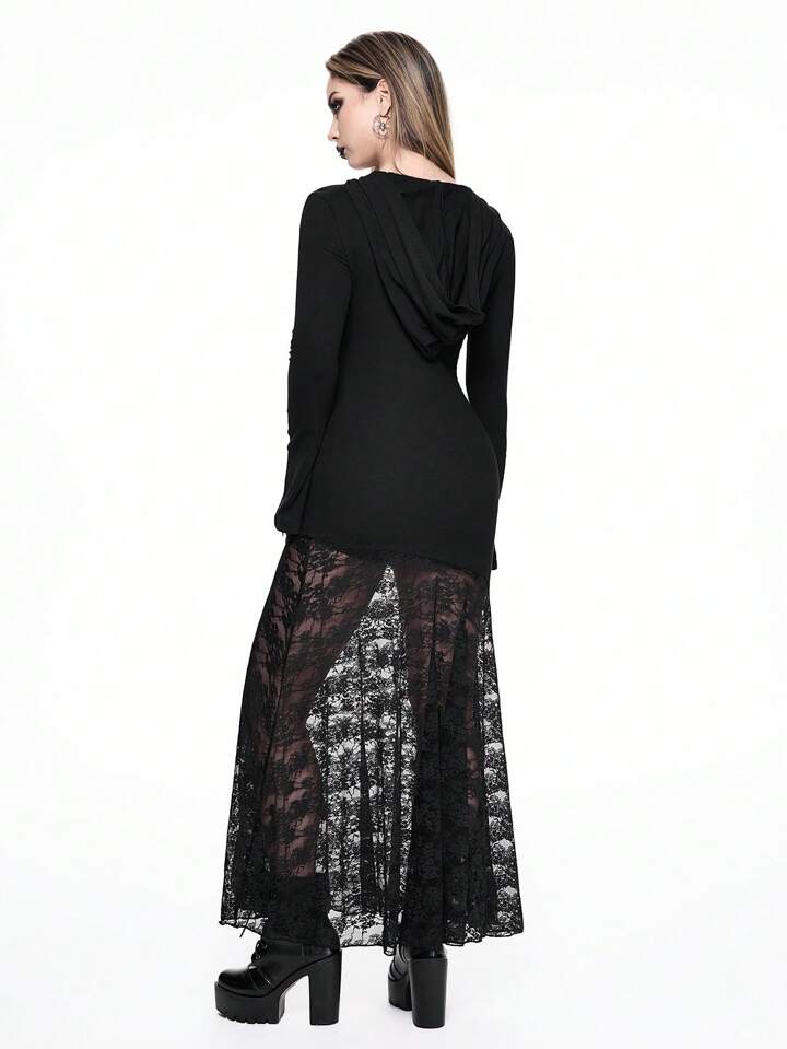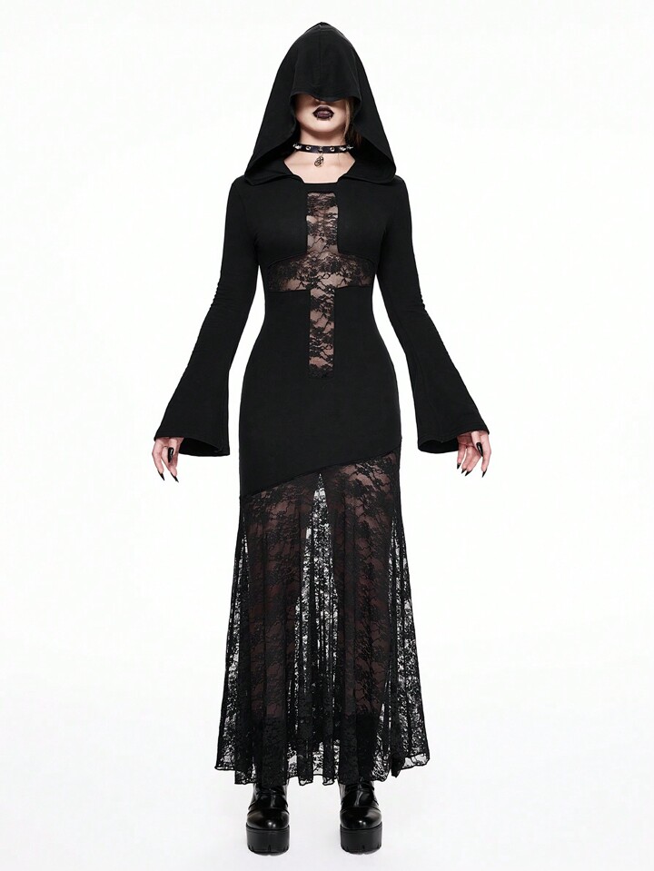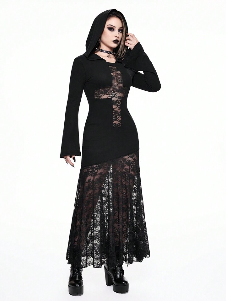 Gothic-Stil Kontrast Spitzen-Kreuz-Stickerei Maxi Kapuzenkleid mit Fischschwanz