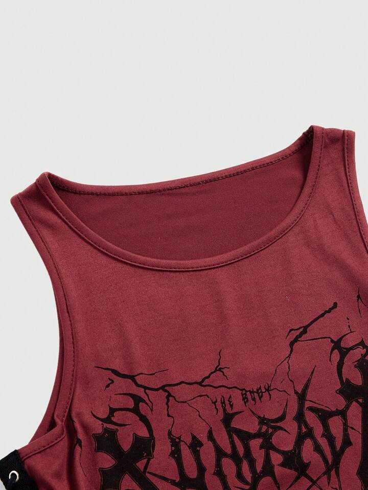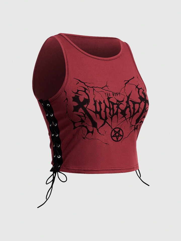 Goth Gotischer Stil Ärmellos Top mit Kreuz- und Pentagramm Muster, seitliches Schnürband, Schule
