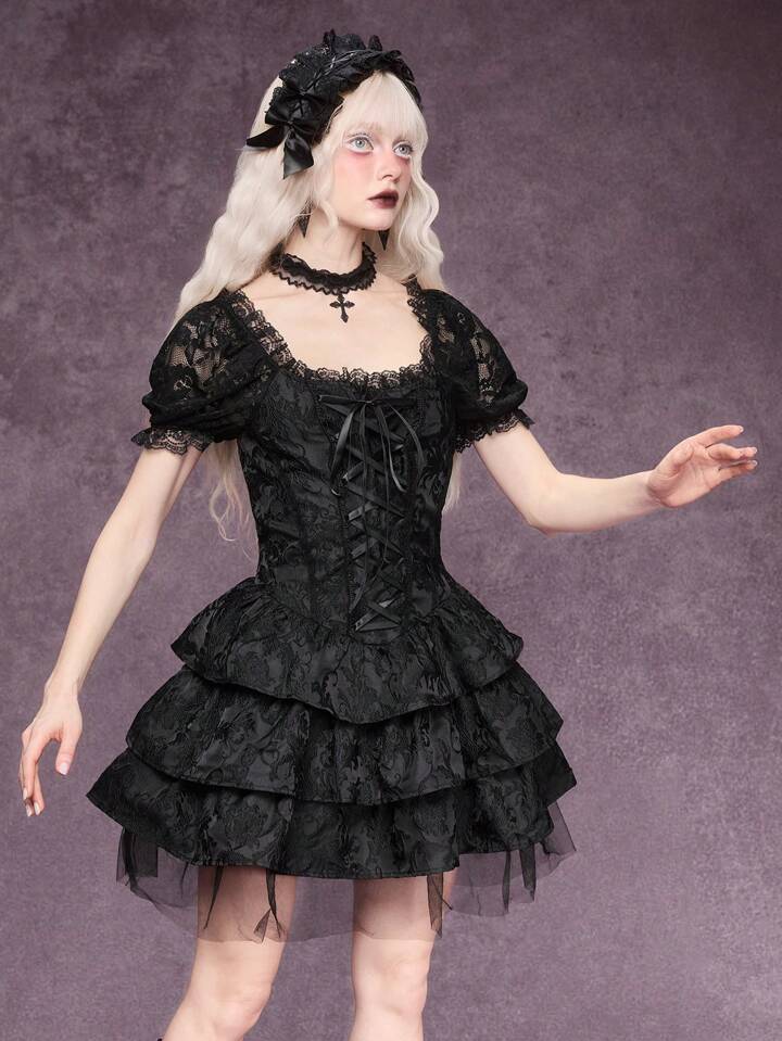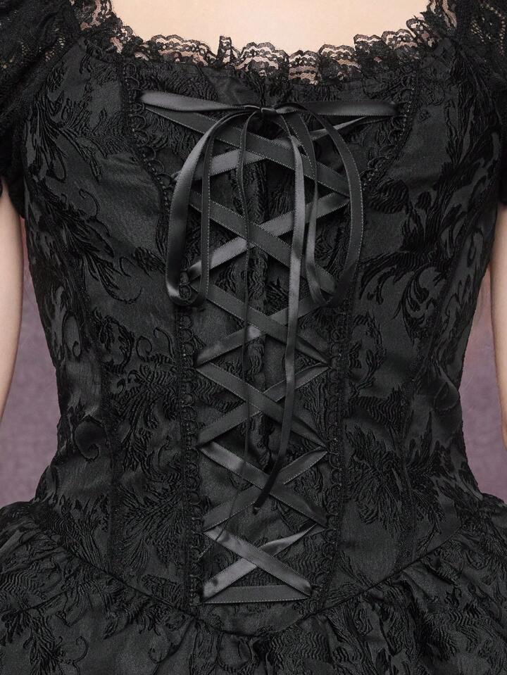 Goth Gotischer Stil Jacquard Blumen- und Rankenmuster Spitzen-Bandschnürung Design Damen Mini-Kleid