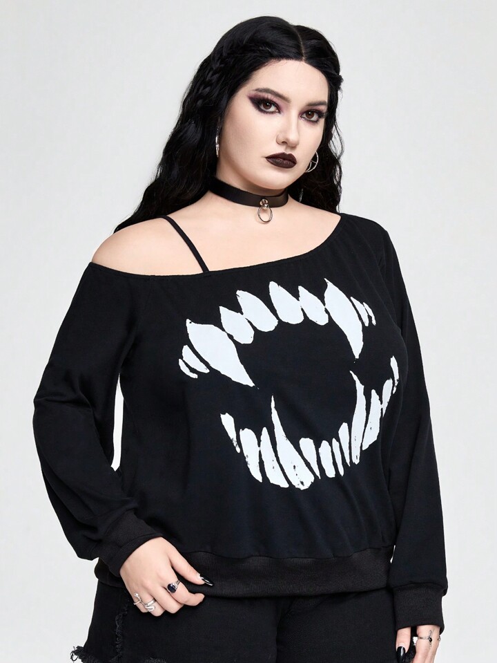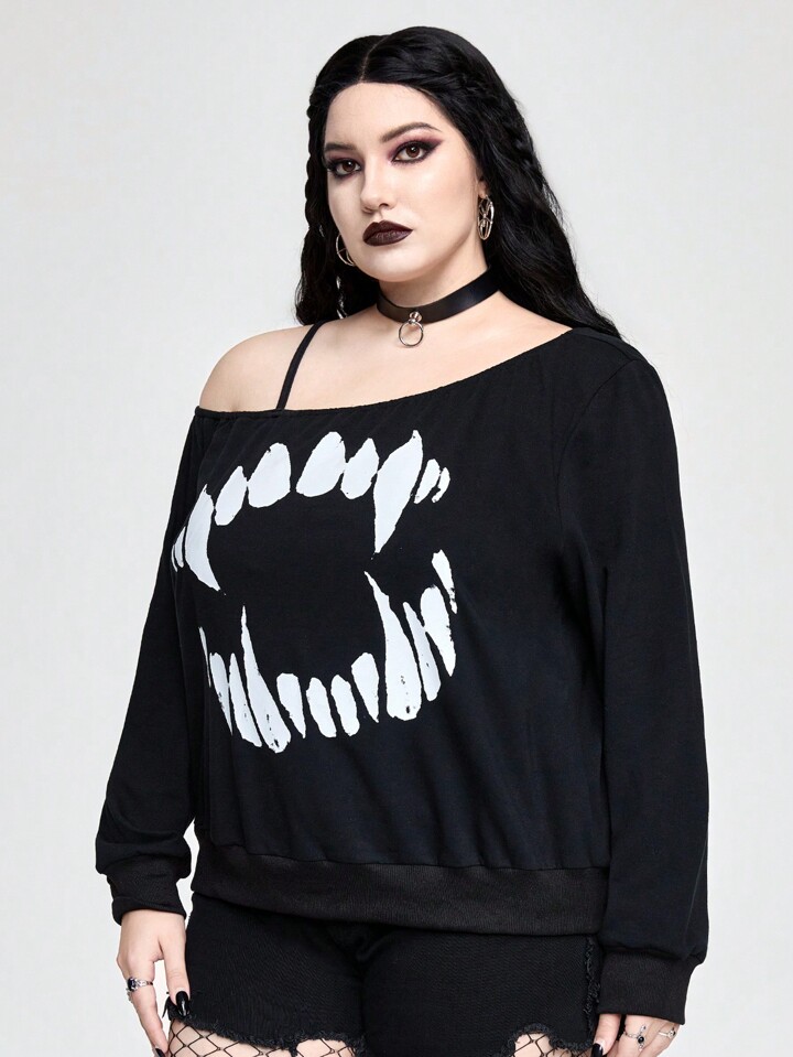 Gothic Stil schräger Schulterriemen Fang Muster Große Größen Damen locker sitzender Langarm Baumwollmischung Sweatshirt, Weihnachten