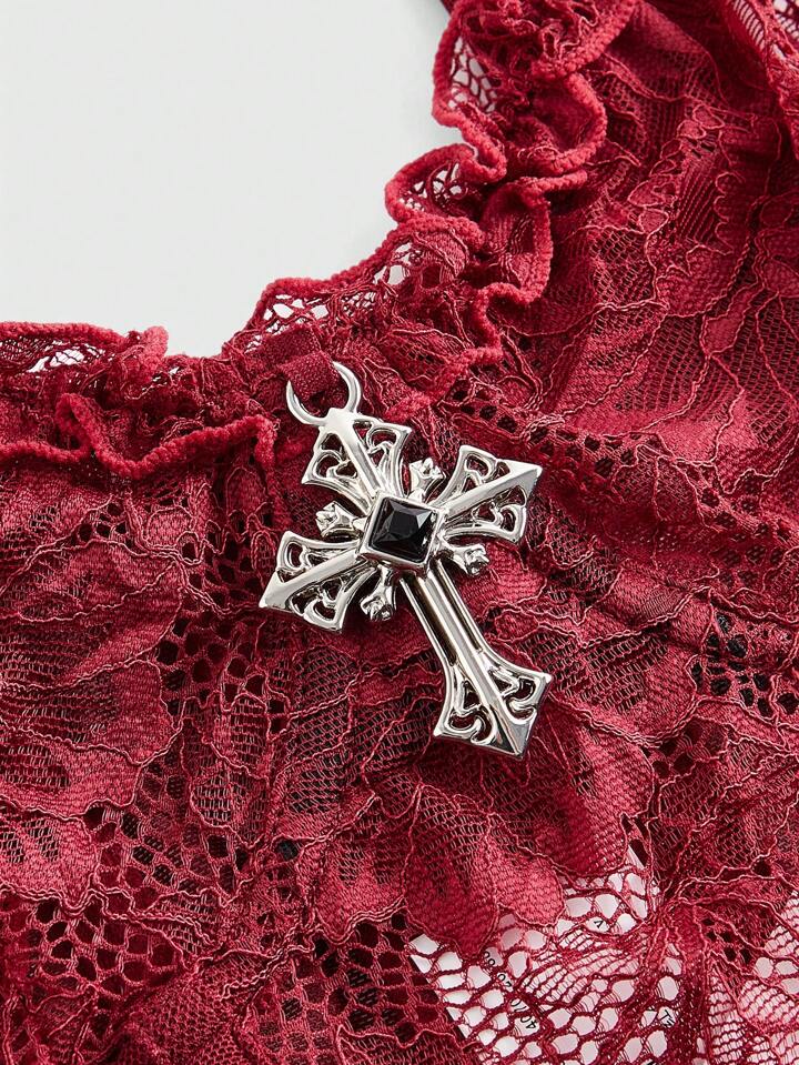 Gothic Stil rotes Spitzen Kreuz Anhänger, sexy Trägershirt für Damen