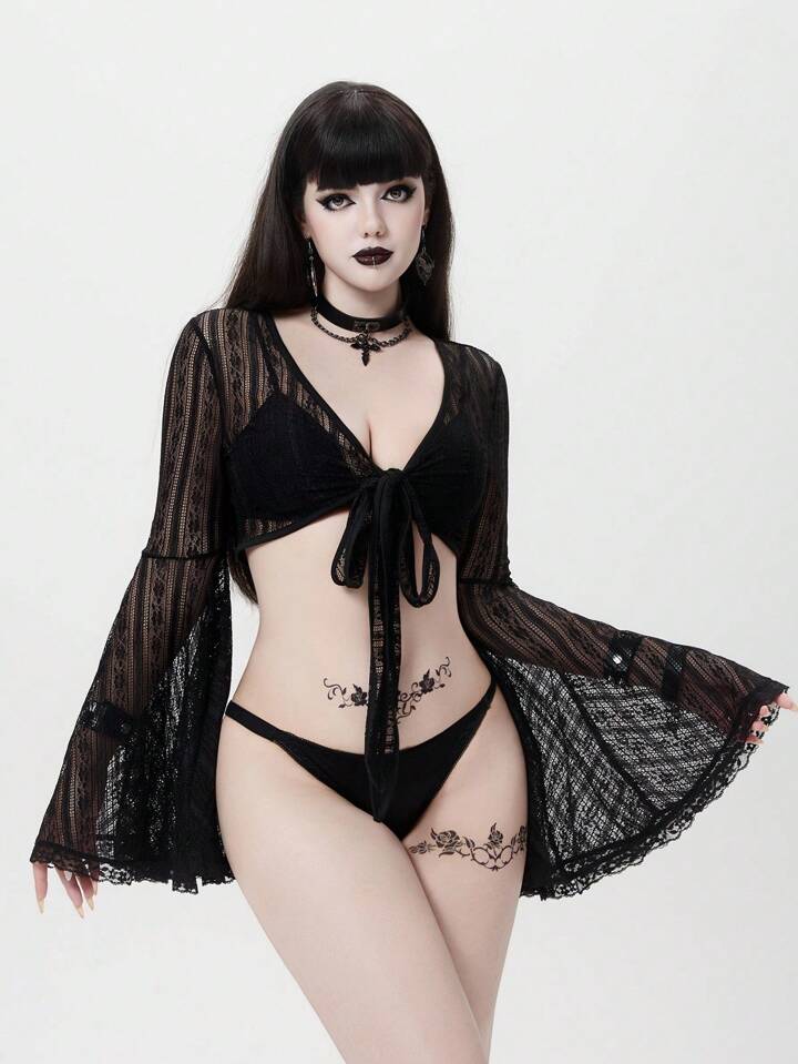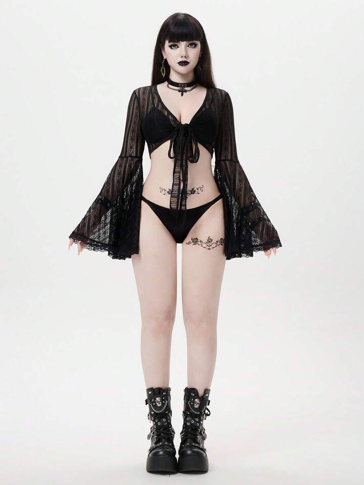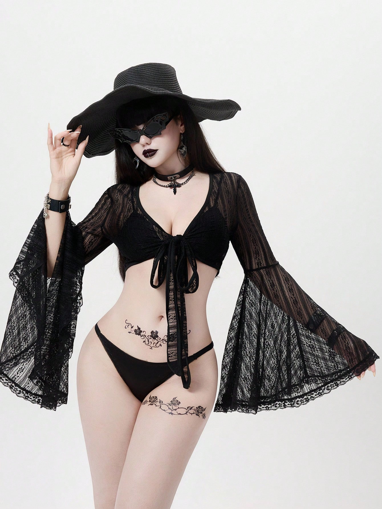 Goth Gotischer Vampir-Graf Ausschnitt-Spitze Glockenärmel Crop Kimono, Halloween