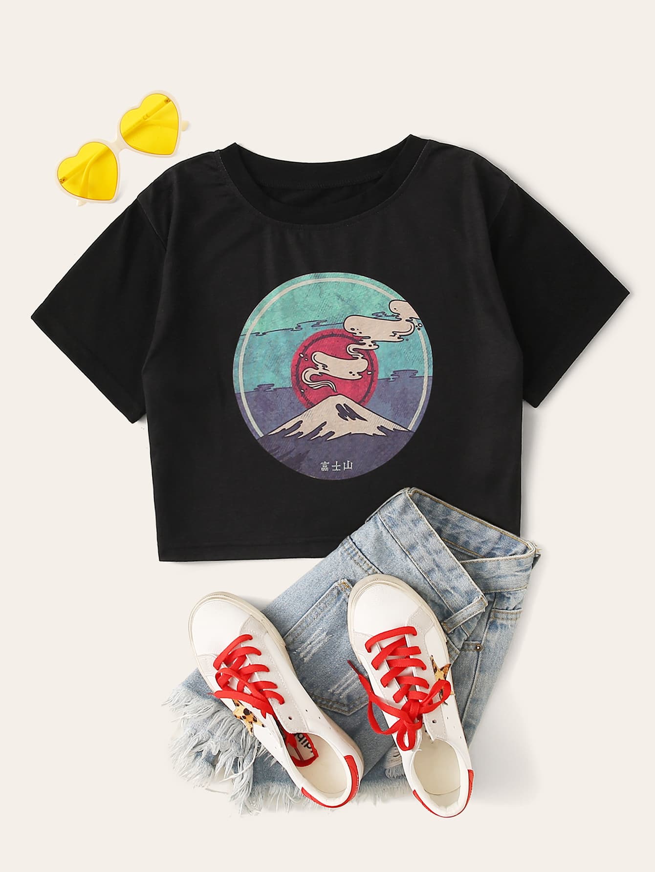 Schwarz Grafik Lässig T-Shirts