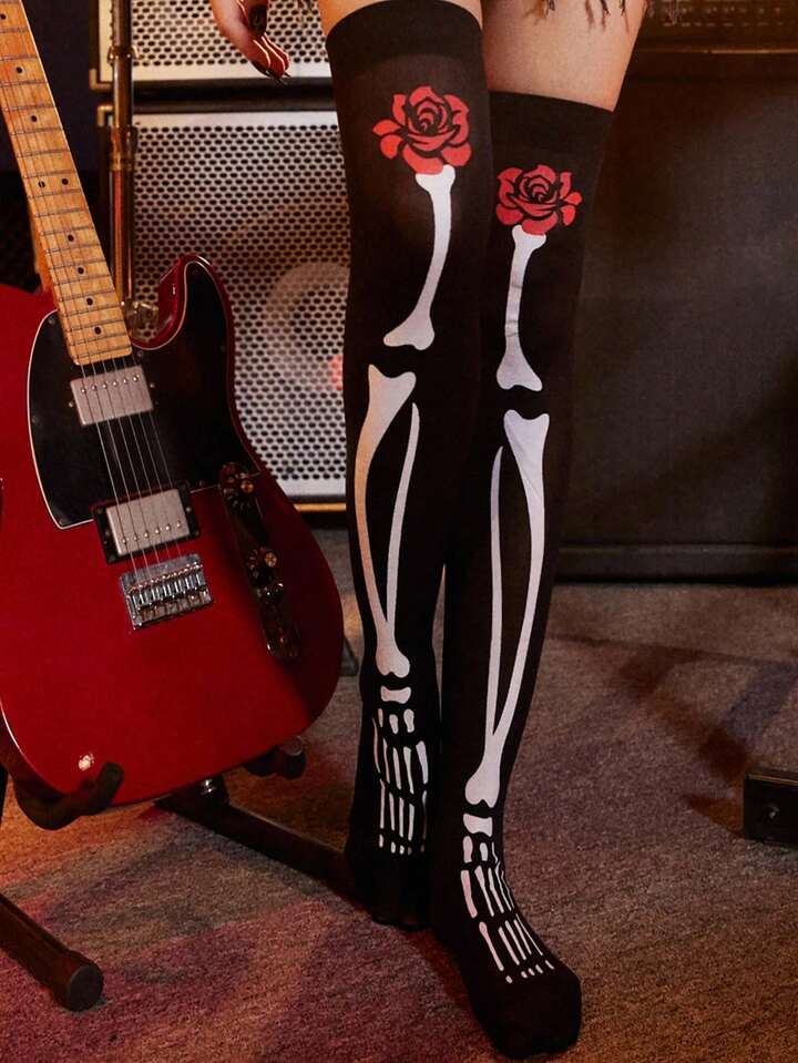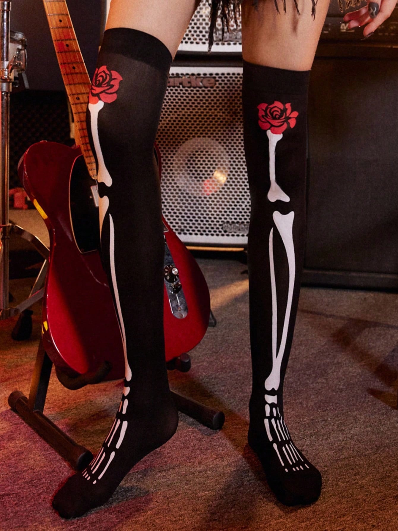 Grunge Punk 1 Paar dunkelrote Skelett Überknie Strümpfe, Halloween