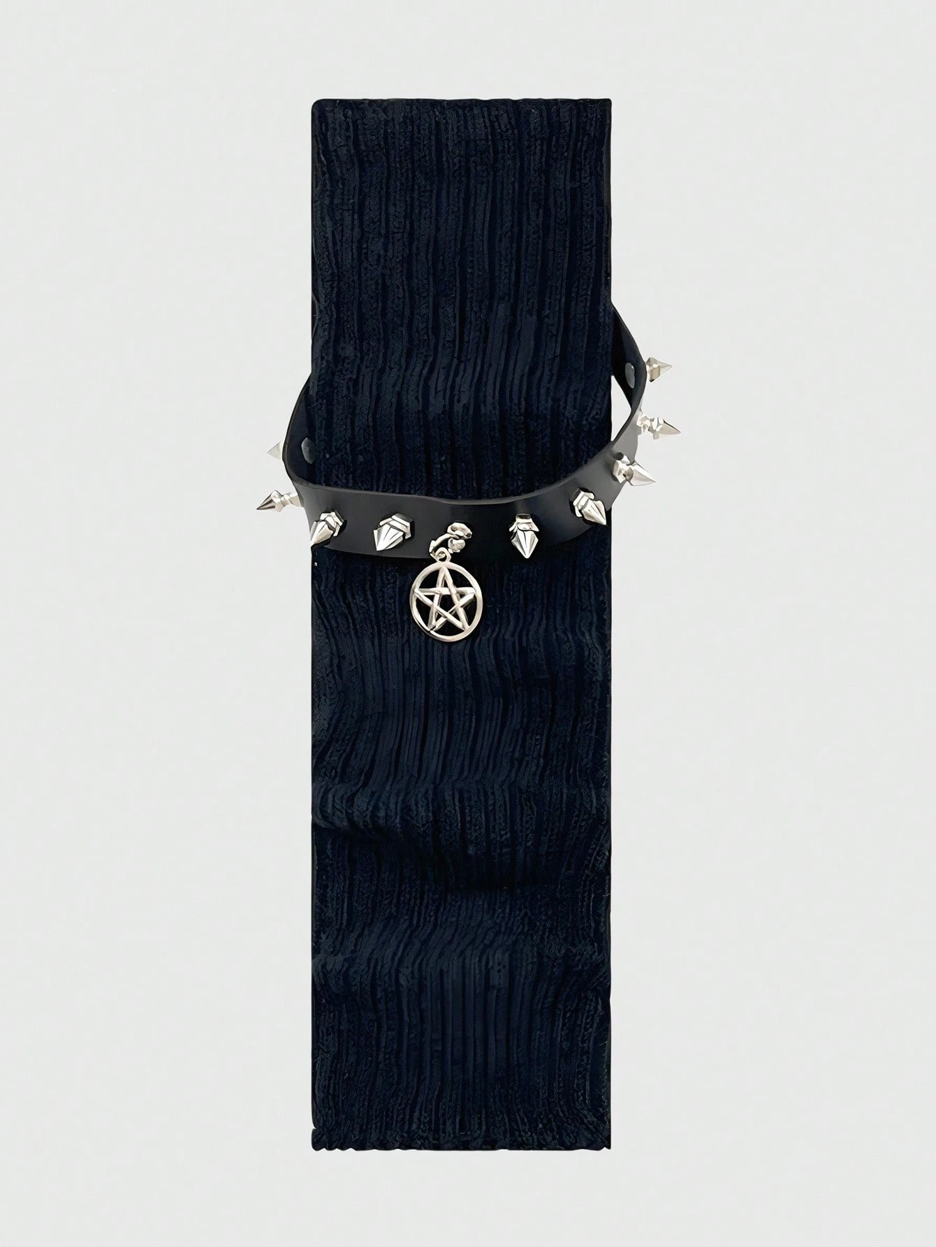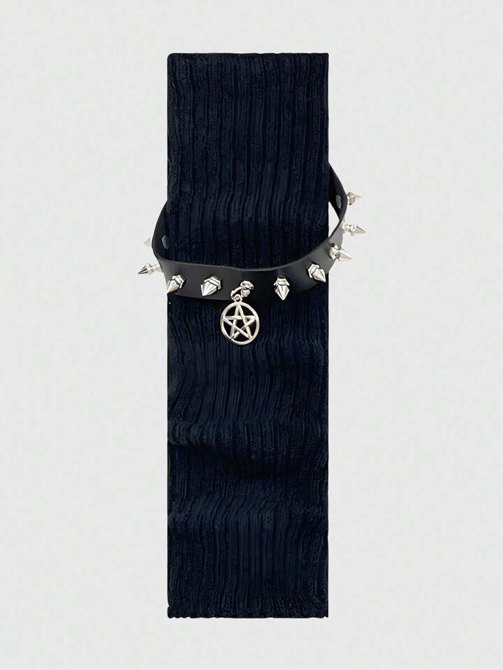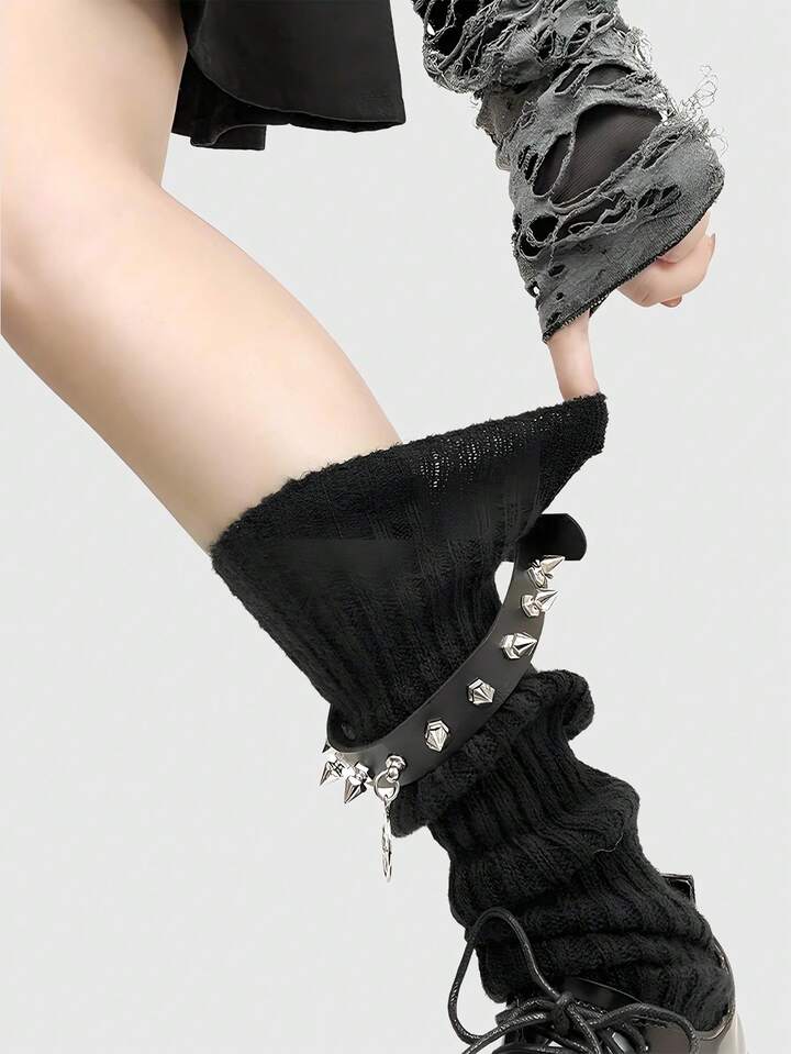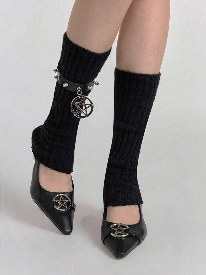 Grunge Punk 1 Paar Punk-Stil schwarze gestrickte Beinwärmer + Fünfzackiger Stern Nieten PU-Leder Beinmanschetten, Gothic ausgestellte gestapelte Beinwärmer, Mode & schlank, geeignet für den täglichen Gebrauch und Festivalpartys, Halloween