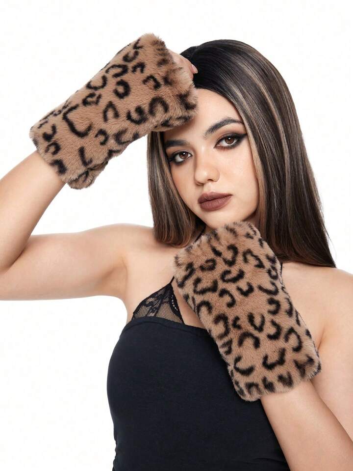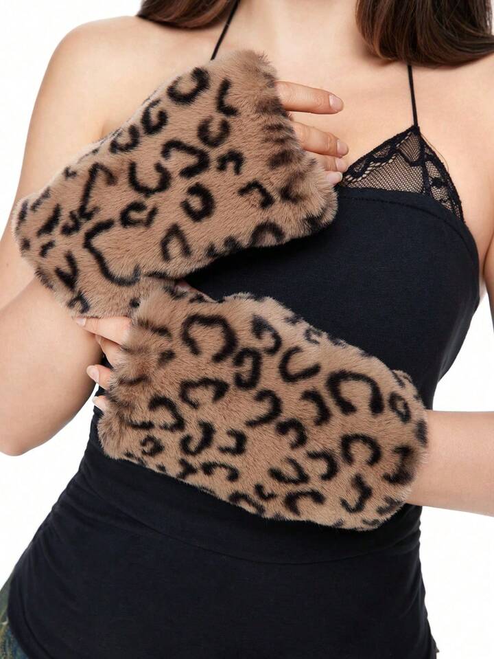 Grunge Punk 1 Paar Punk-Stil Leoparden-Muster Handschuhe, Y2K flauschig warme Handschuhe