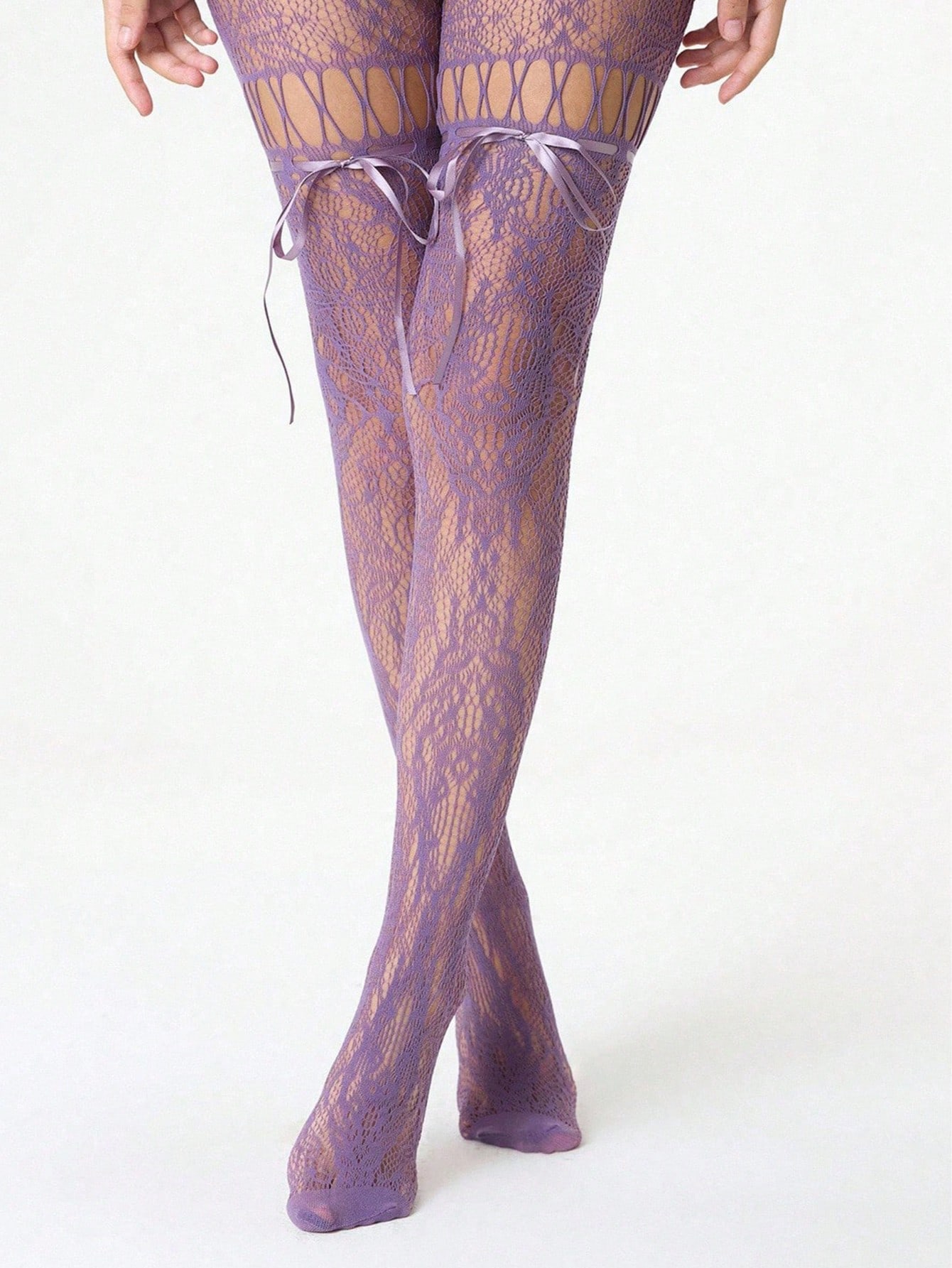 Grunge Punk 1 Paar sexy Netzstrümpfe, lila Jacquard-Schnürstrumpfhosen im Vintage-Stil, ultradünne, elastische, durchsichtige Leggings, Cut Out