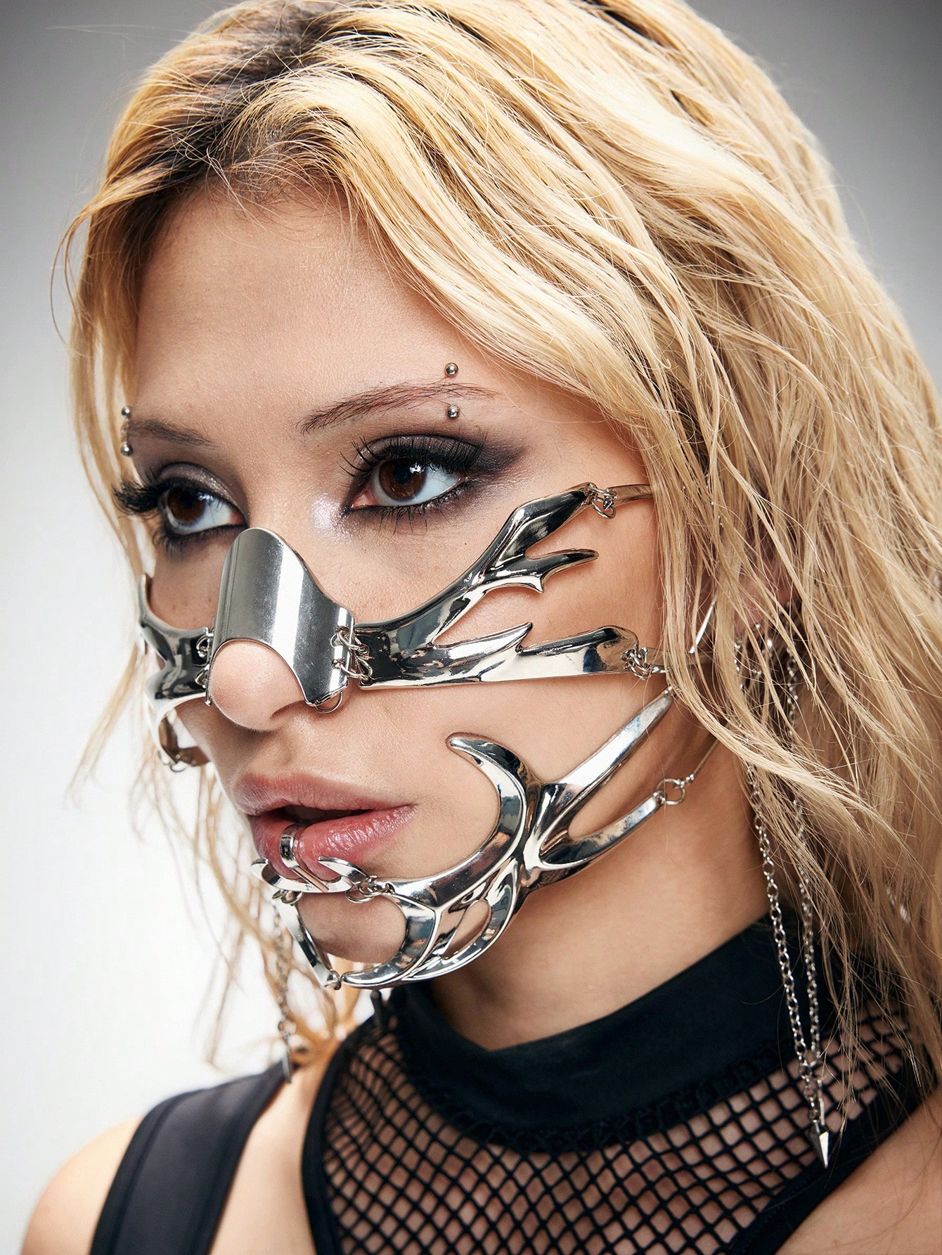 Grunge Punk 1 Stück Cyberpunk Stil Metall Nasen Piercing + Metall Mund Ring Kinn Deko Kombination, futuristische technologische fließende geformte Maske, kreatives Masken Accessoires Set
