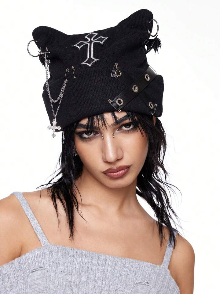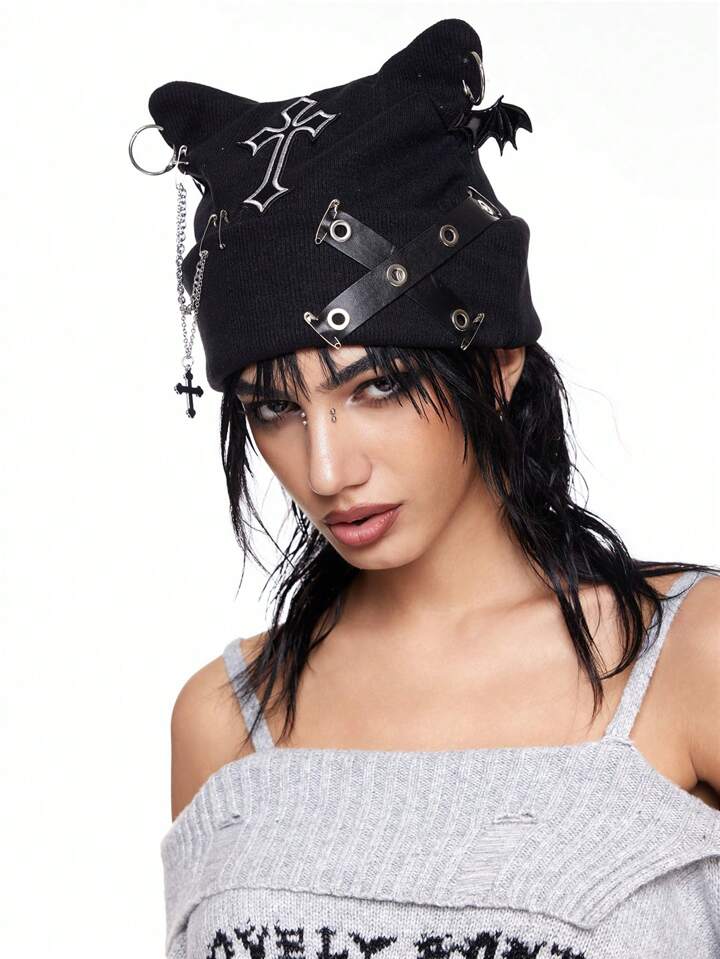 Grunge Punk 1 Stück Damen niedlicher, basischer Stil, Y2K-inspirierter, Streetstyle, gehörnter, strukturierter Strick-Cross-Deko-Beanie, geeignet für Lässig und Schule, Winter