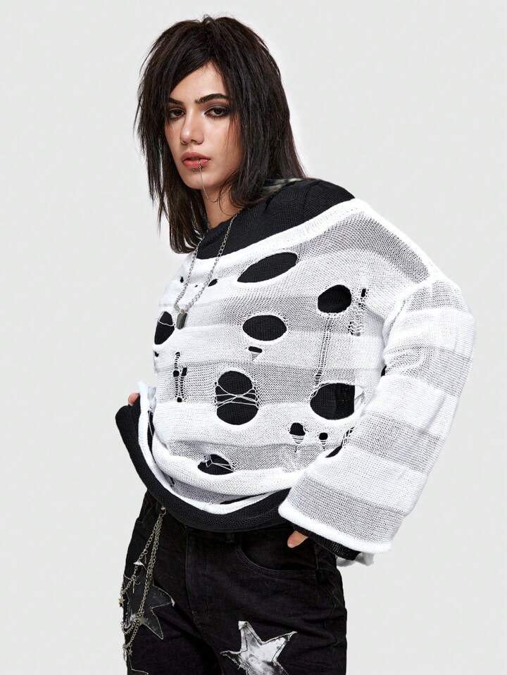 Grunge Punk Pullover mit 2 in 1 Streifen Muster, Drop Shoulder