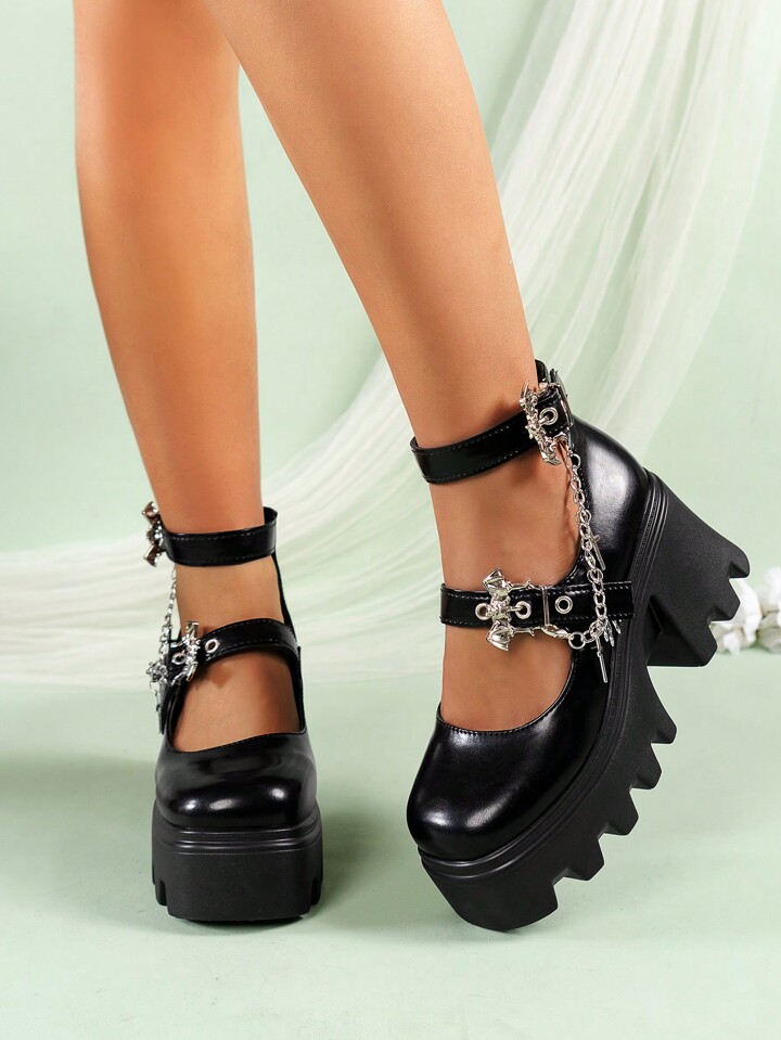 Grunge Punk 2024 Neue Frühling/Herbst outdoor Mode lässig Metall Schnalle Kette Anhänger Chunky Absatz & dicke Sohle Damenschuhe Herbst Neujahr Valentinstag