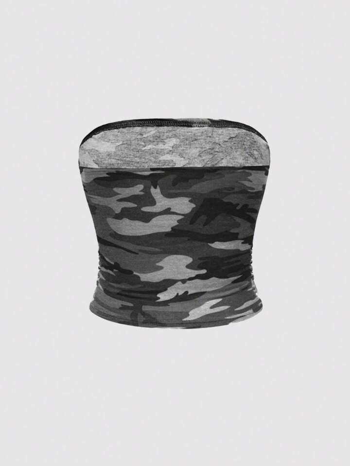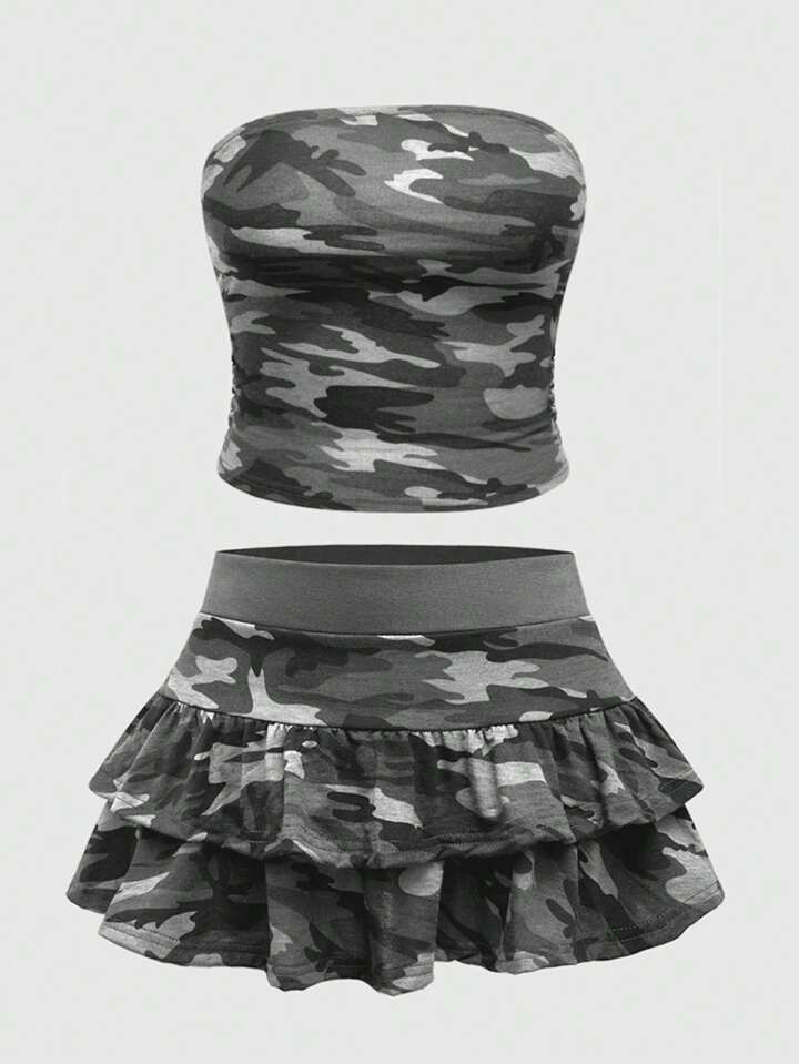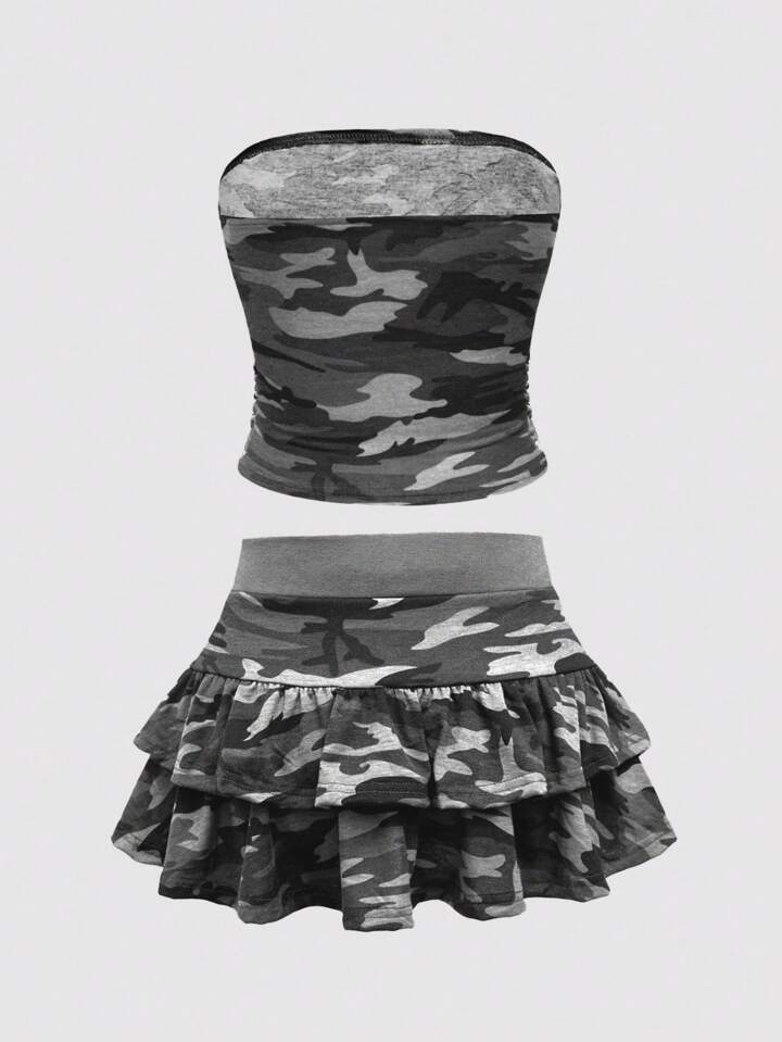 Grunge Punk 2 Stücke Y2K Große Größen Sexy Camouflage Komplett-Muster Crop Top und Mini Rock Set