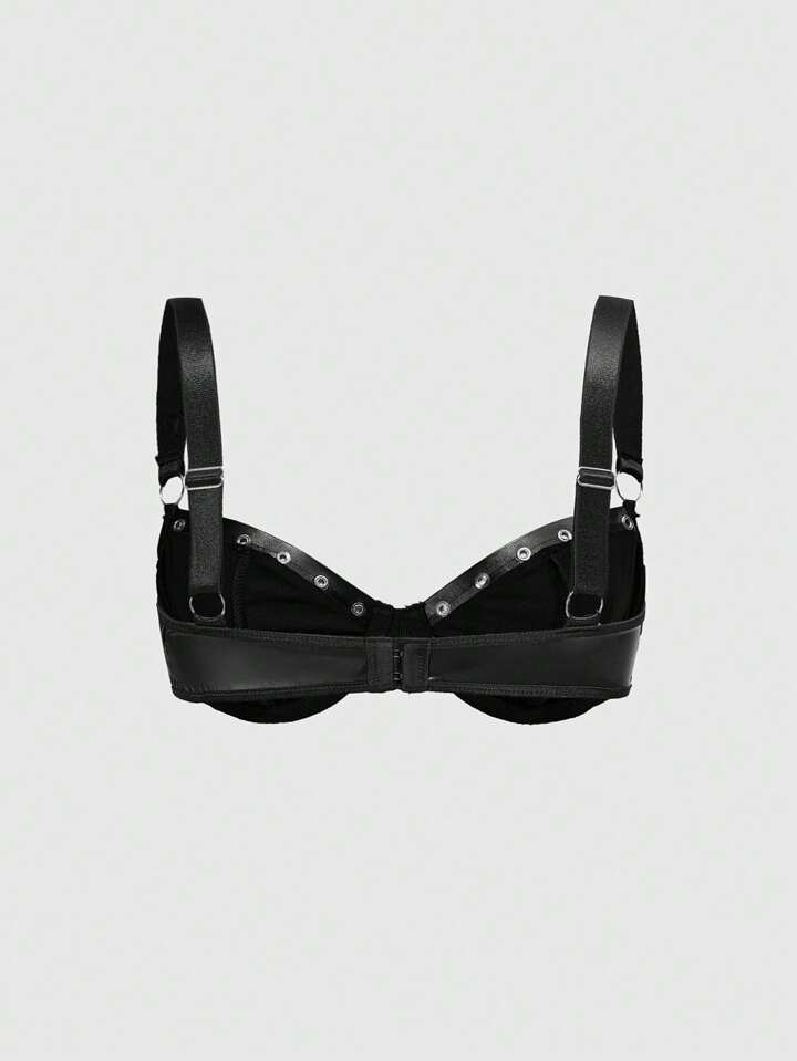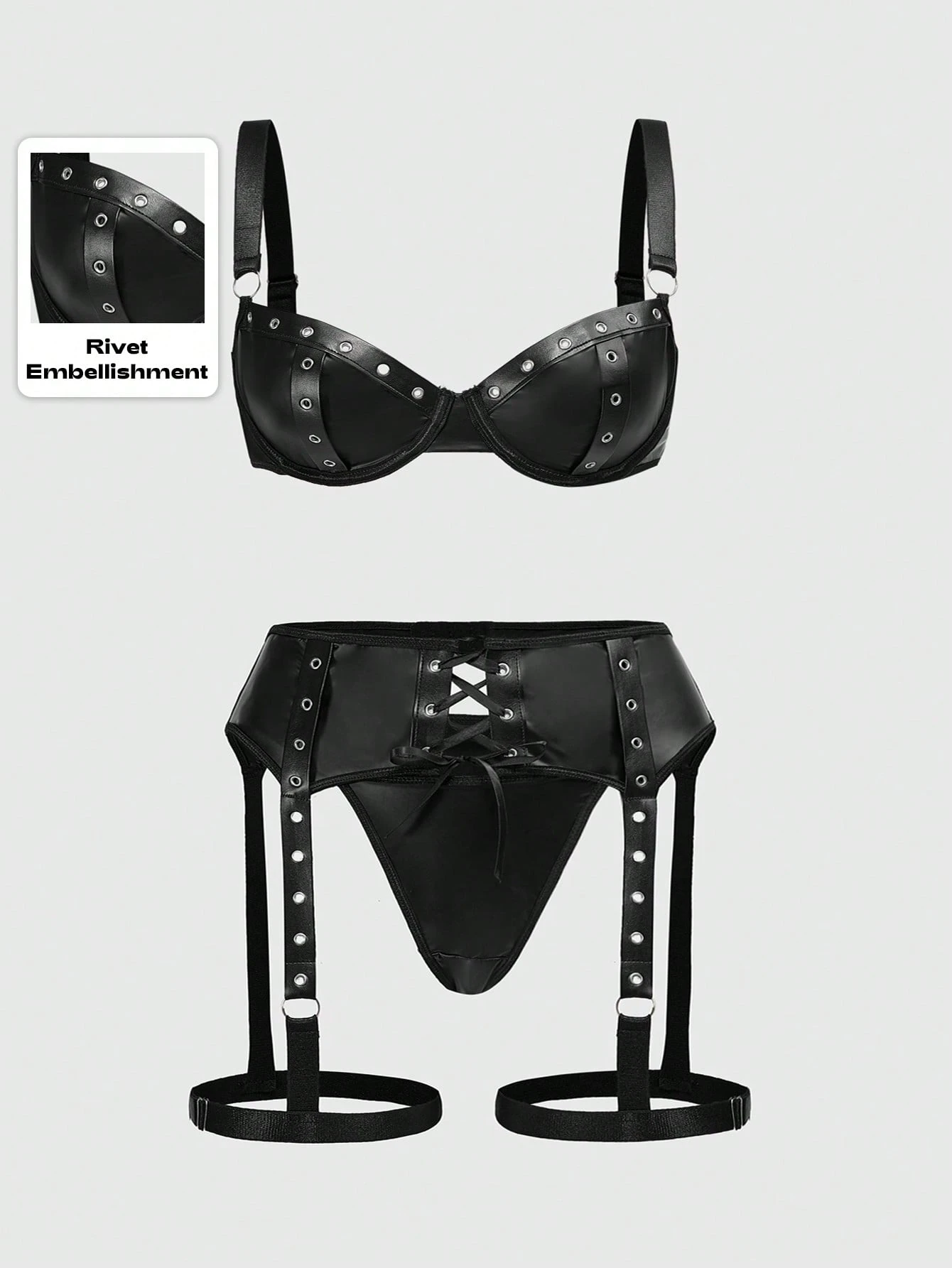 Grunge Punk 3 Stücke Große Größen Punk Motorrad Leder-Look Ösen-Riemen Unterwäsche Set: BH-Träger, String-Slip und Strumpfhalter-Gürtel