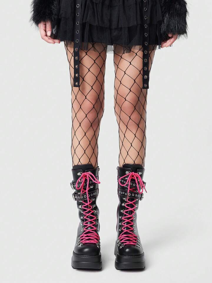 Grunge Punk Schwarze Punk Rock Schnür-Rosa Y2K Gothic Party Riemen Schnallen Motorrad Stiefel bis zur Mitte des Wades für Frauen