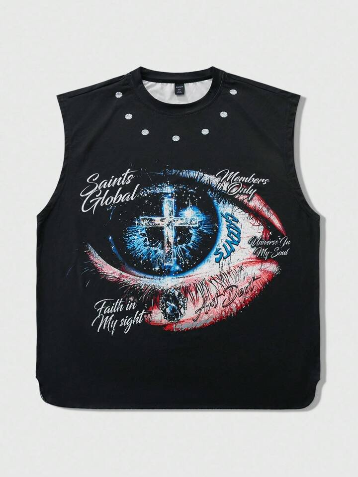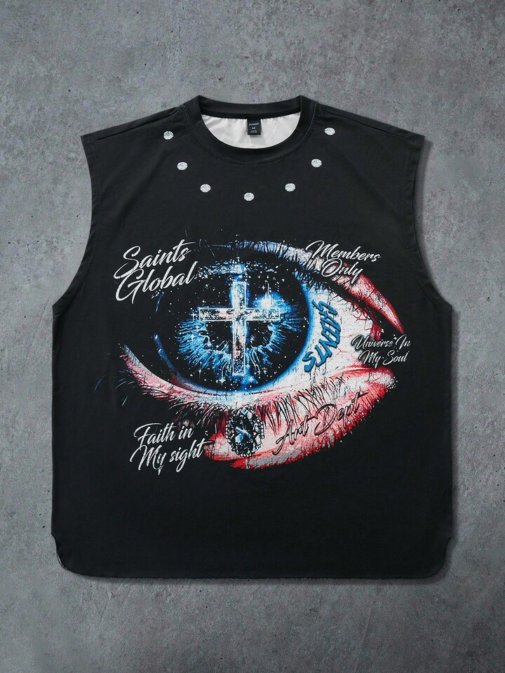 Grunge Punk Schwarzes kurzes Herren-Tanktop mit mysteriösem Augen-Grafik, Straßen-Stil, 2000er Jahre Stil