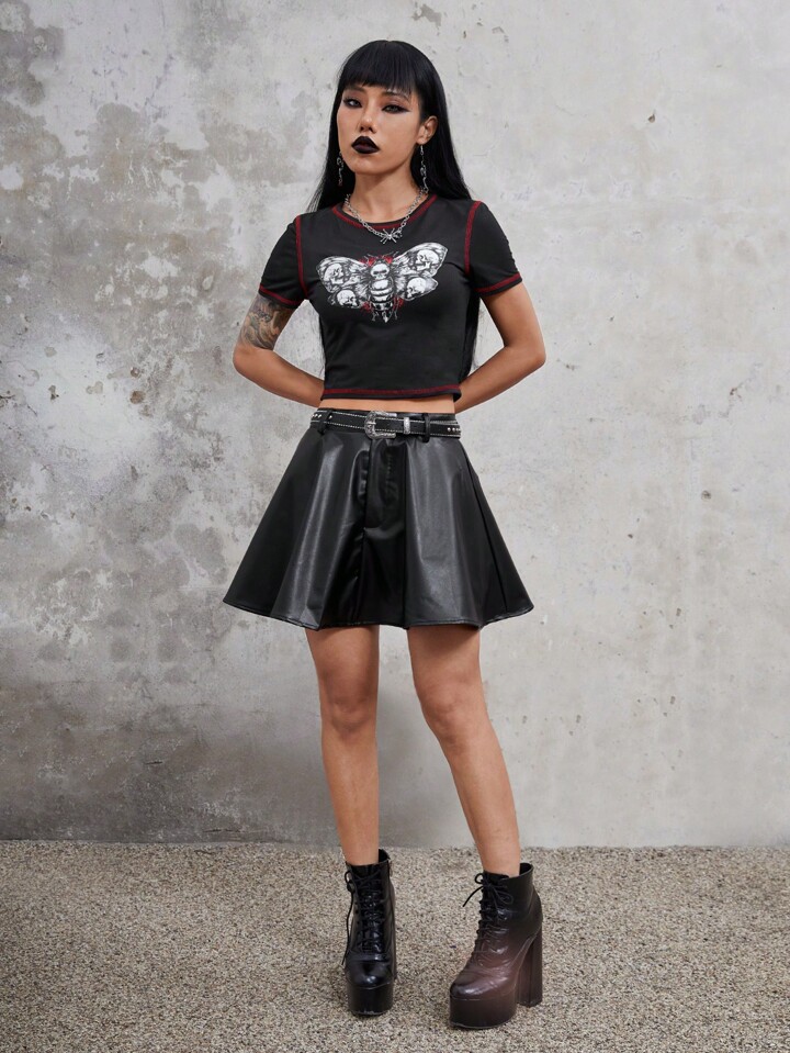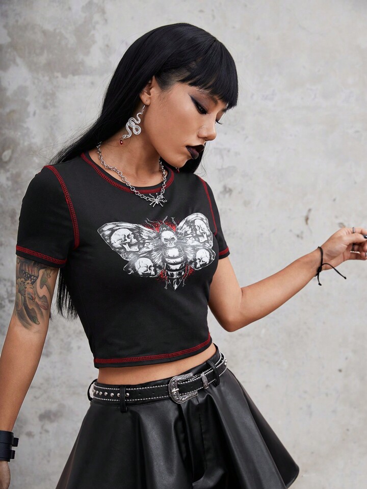 Grunge Punk Crop T-Shirt mit Schmetterling & Schädel Muster, Absteppen,