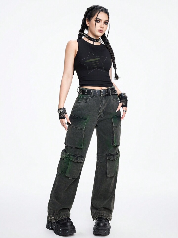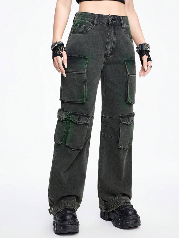 Grunge Punk Coole Straßen-Style locker sitzende, ausgewaschene grün bemalte Damen-Denimhose mit Taschen