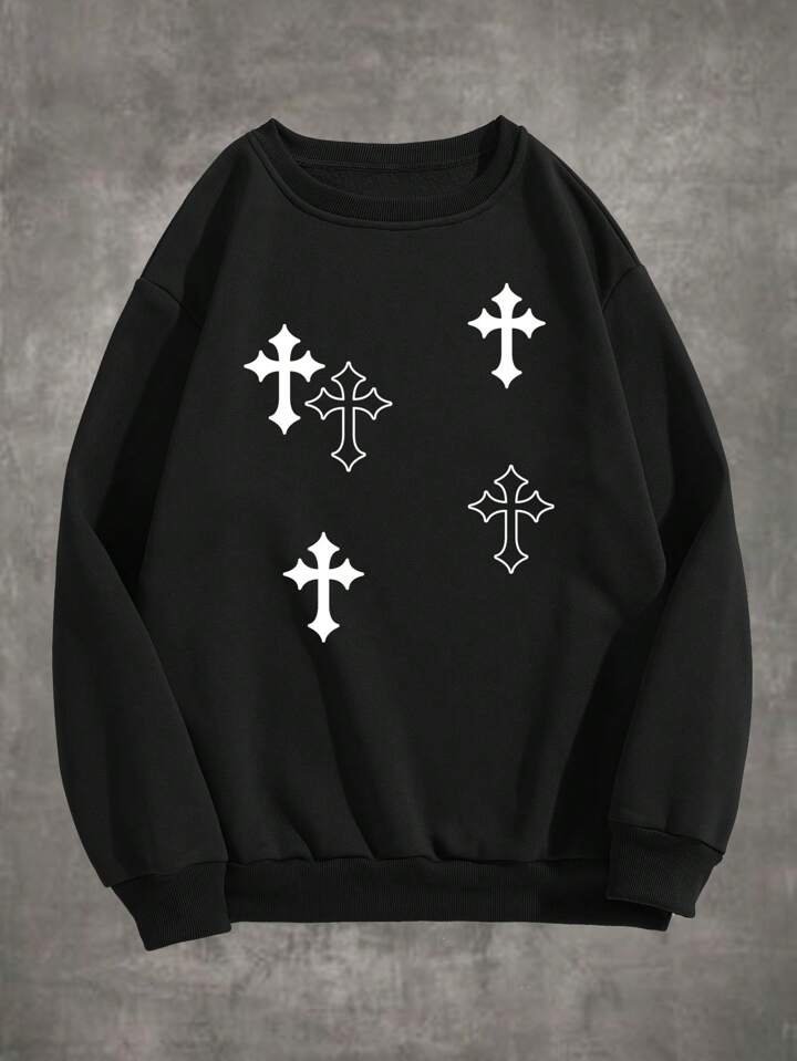 Grunge Punk Sweatshirt mit Kreuz, Muster, Thermal Futter,