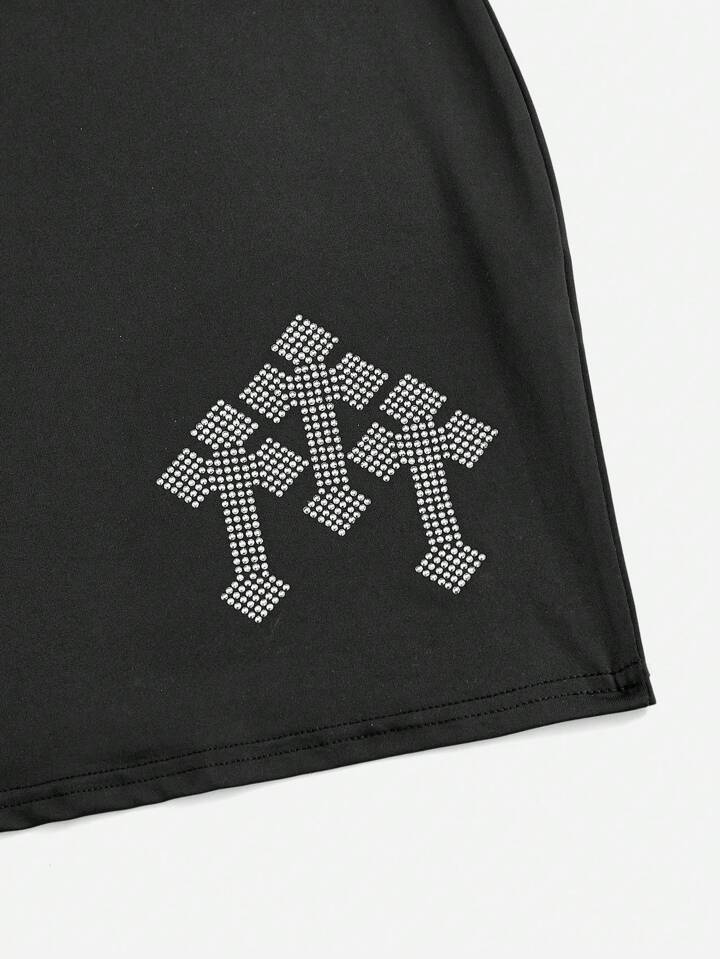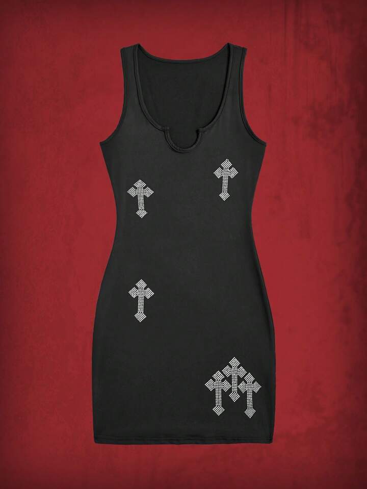 Grunge Punk Figurbetontes Kleid mit Kreuz, Strass, eingekerbtem Kragen