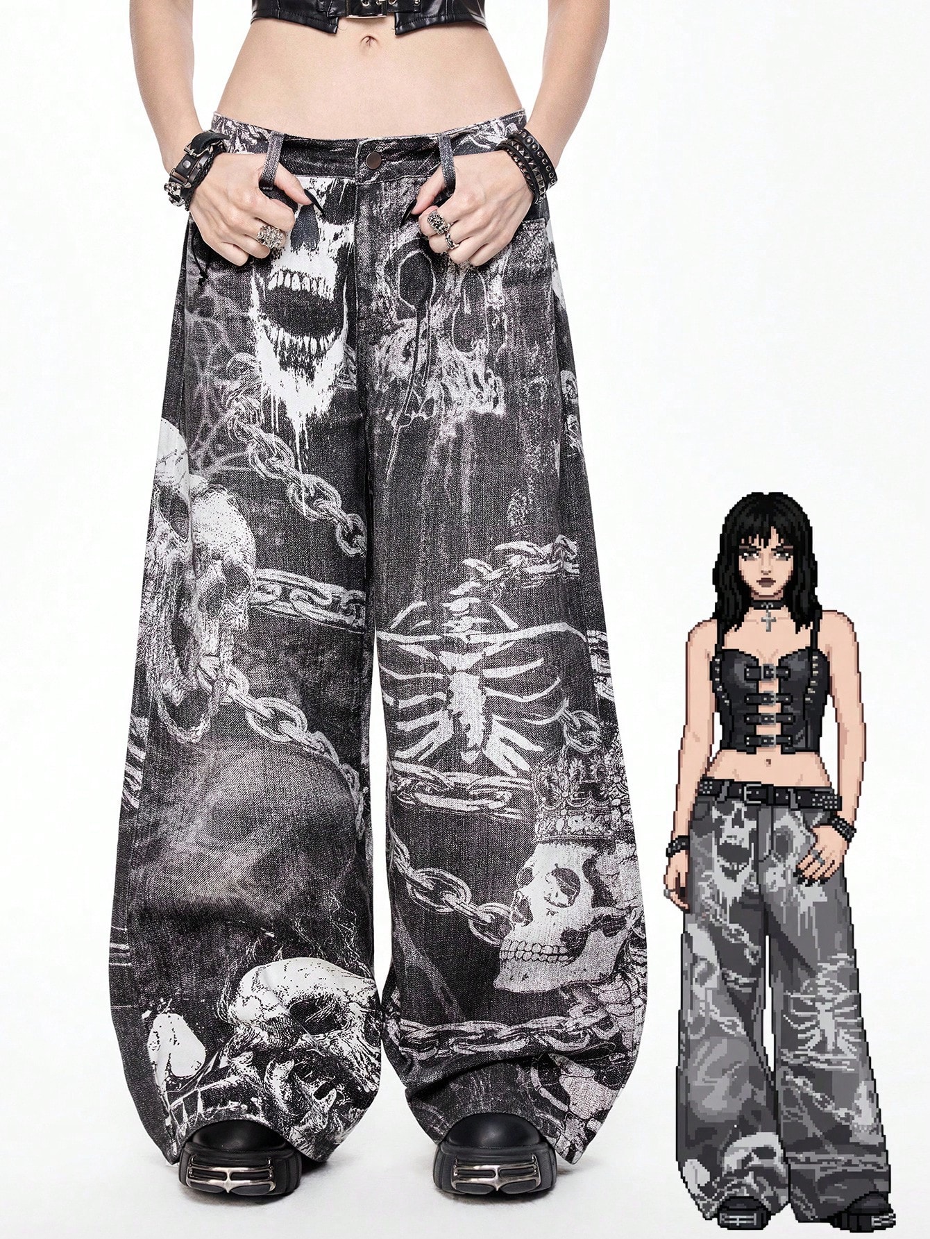 Grunge Punk Dunkel Gothic Totenkopf Skelett Ketten Muster weite Schlupfhose