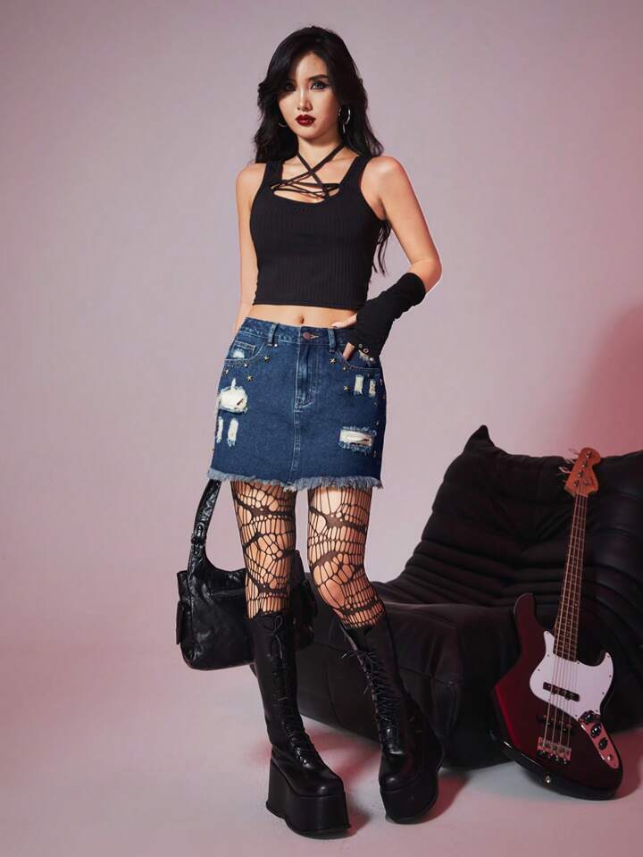 Grunge Punk Jeansrock Mit Zerstörten Details, Sternen-patches Und Fransen-saum